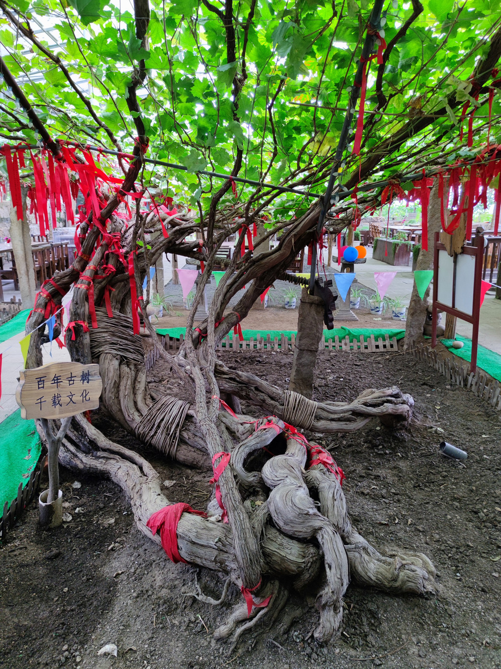 开车前往昌黎葡萄沟,葡萄沟位于曹操“东临碣石,以观沧海”中的碣石山的背坡处,远观山体砂岩外露,颇具观赏性,非久经风暴洗礼或海浪冲刷不能成此形状,难怪曹阿瞒观后生此豪情。进入农家庭院参观树龄达152年的葡萄树王,其粗大枝干在地面盘根错节,如虬龙转身。沿葡萄长廊上溯,观看架设在路面上圆弧顶棚果实累累的葡萄树,收获满心的喜悦。下山买了阳光玫瑰葡萄,很甜,其它品种如巨峰和玫瑰香可能由于今年雨水太多,甜度略低。中午饭在当地翡翠轩吃。晚上七点冒雨回到北京,结束此行。