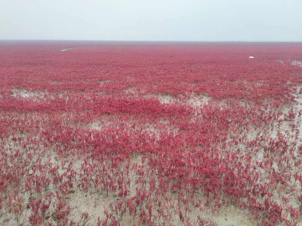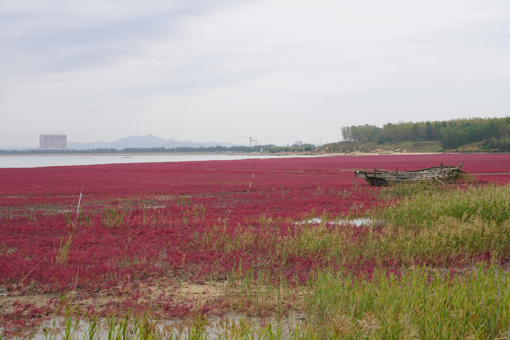 开车前往红海滩国家风景廊道,高速路上,遭遇冰雹袭击,那种冰雹砸在车窗传来连续爆裂的声音异常恐怖,似乎挡风玻璃随时会被砸个大窟窿,我又想到轿车溜滑的外观会不会被砸得到处凹坑,又很心疼。冒着冰雹雨徐徐前行,心急如焚,幸好找到一处桥底,不管了,就停在下面躲避,不多久便有一堆轿车挤在一起,把高速路都堵掉了,我极担心后面会不会有大货车刹不住车,那便是一窝端。十分钟后,冰雹停歇,急忙继续前行。在漫天乌云下到达红海滩北门,下车我急忙检查汽车外观,万幸完好,不免心生欢喜。