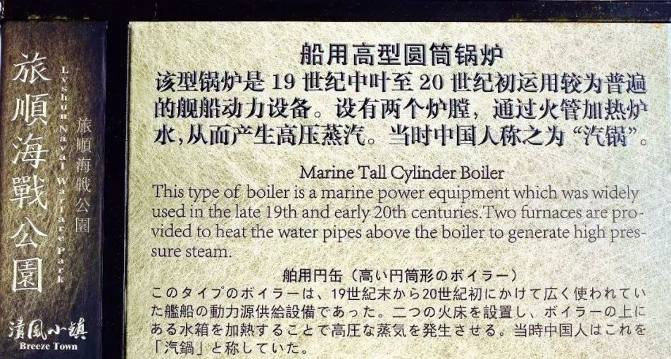 公园的广场上陈列着与旅顺海战相关的螺旋桨、锅炉、舰炮、船锚、沉船残骸等展品20余件。照片摄于旅顺海战公园广场。