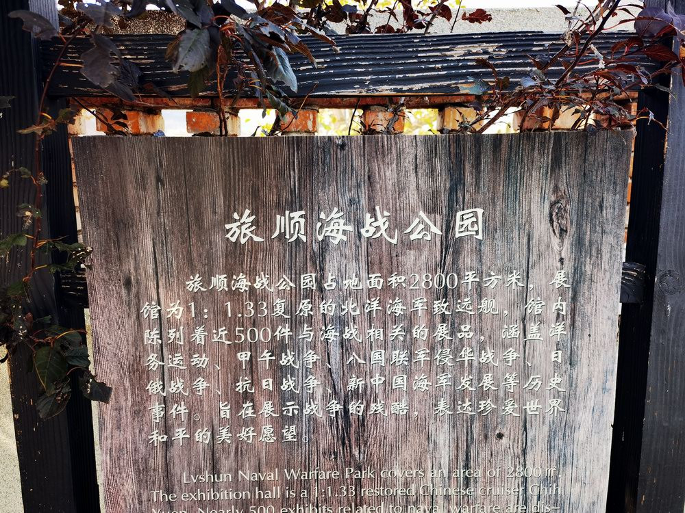 公园占地面积约2800平方米,建设耗时1年,投资约2000万元,旨在展示战争的残酷和中国海军的发展历程,表达珍爱世界和平的美好愿望。图为旅顺海战公园的简介。