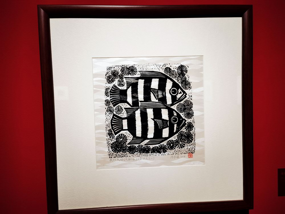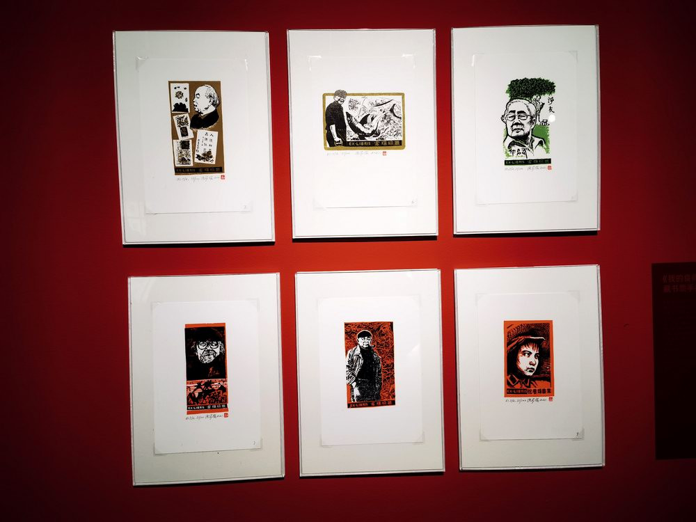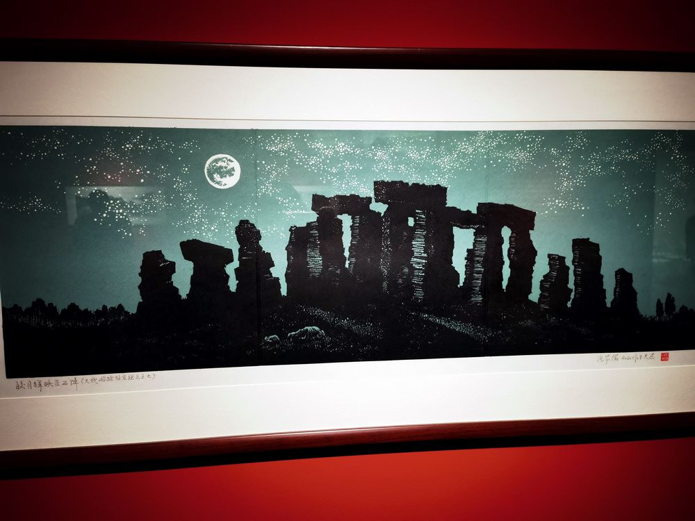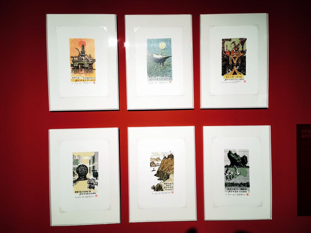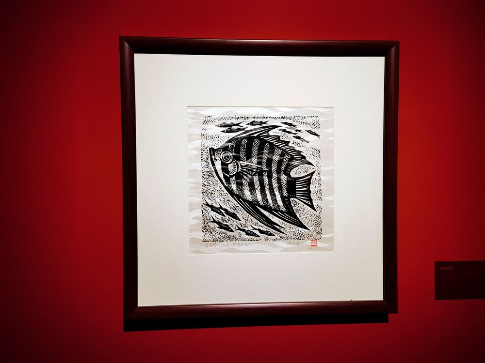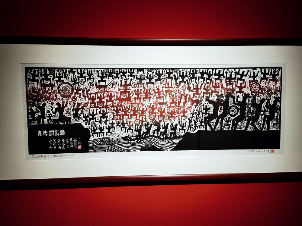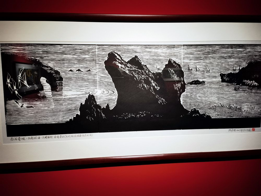 第一个展厅展出的作品,是张家瑞近年来创作的版画和藏书票。图为木板刻画《古柏参天》。
