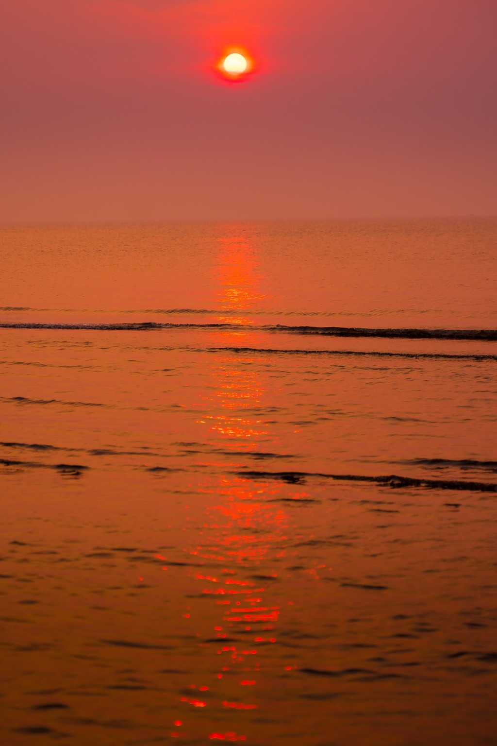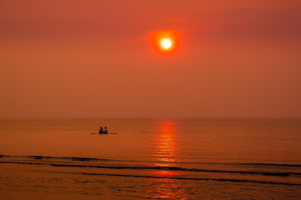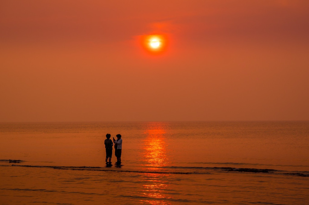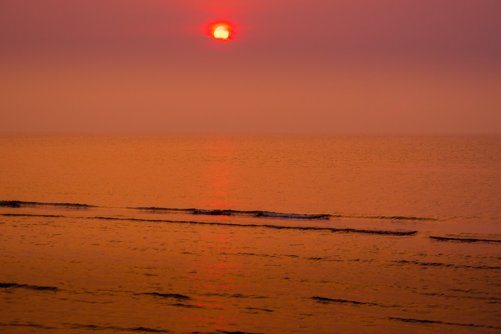 落日隐藏在蒸蔚的海雾中