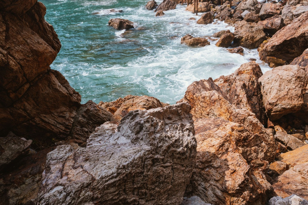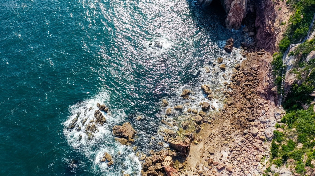 礁石深黑的颜色在阳光的直射下象颗颗饱满的黑珍珠,闪烁在蓝色的海面上。久经风浪,海水的冲击,以沉稳的勇士姿态,扎拫于大海。每当海浪袭来都会撞击出千姿百态的白色浪花和蓝色的海水融为一体,呈现出一幅唯美惊艳的画面,让人们停下脚步,驻足观看。
