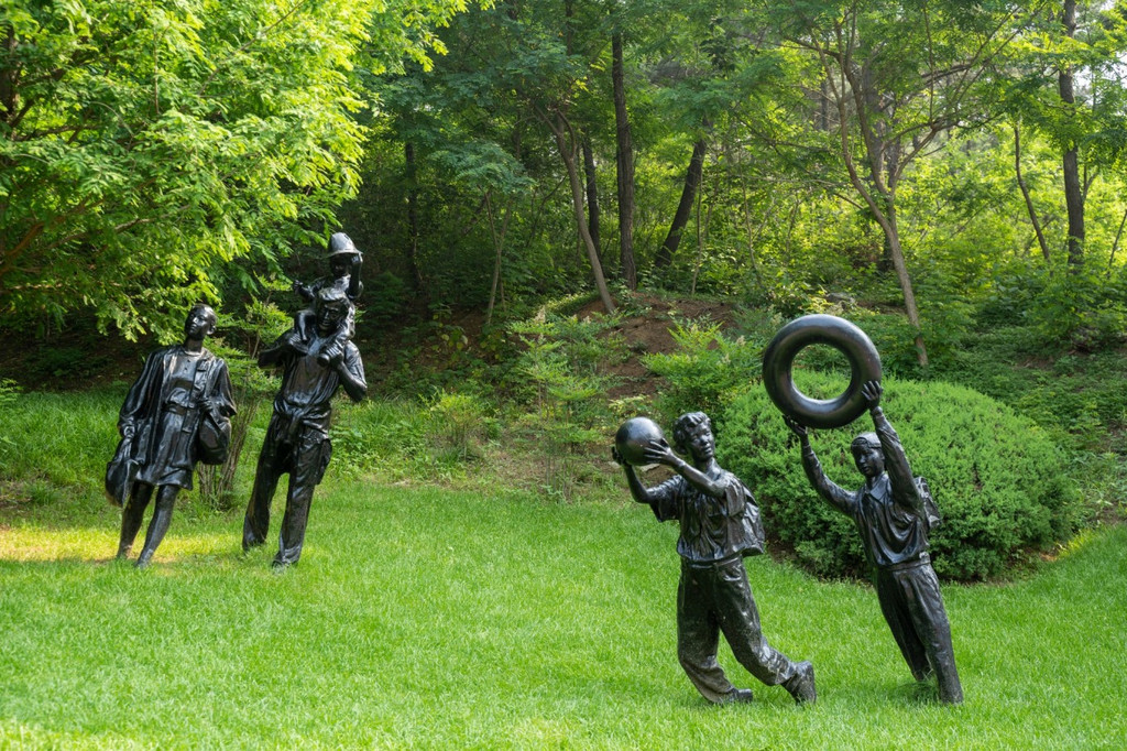 公园内建有许多具有海洋元素的雕塑,青铜色,在海边嬉戏的、乘舟跨海的、抱着游泳圈面朝大海的,生动有趣。