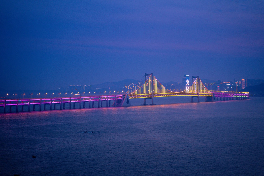 再期盼星海湾跨海大桥的霓虹灯渐次亮起