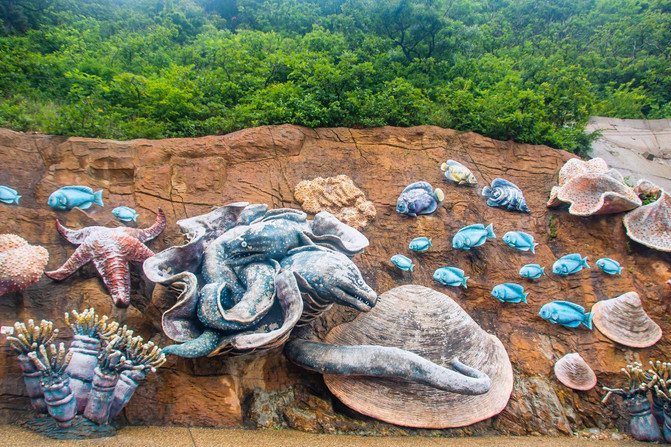 高大的岩石伫立两侧形成峡谷,岩石上镶嵌着各式各样的海洋生物,巨大的乌贼伸着长长的脚,细长的海鳗从岩壁中游过,成群结队的小鱼仿佛真的在海洋中自在嬉戏……近距离观看,相当震撼。