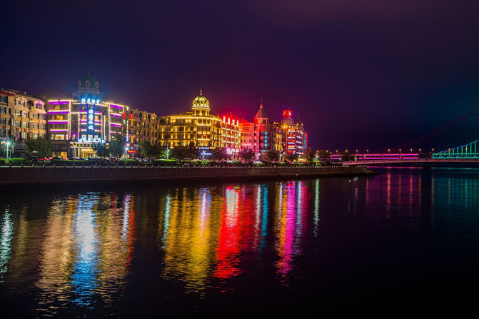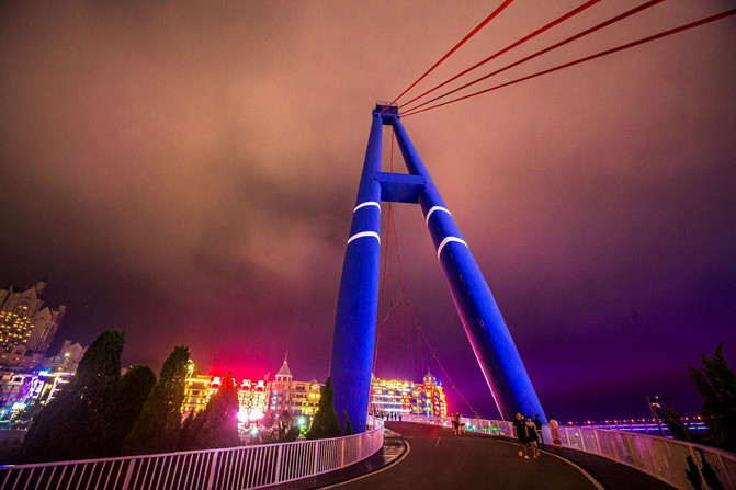 两岸建筑披上七彩灯光,将海水照得斑斓绚烂,璨若星河。灯光勾勒出雄伟的星海湾大桥,从远处看去,如同巨型坚琴立在海面上。