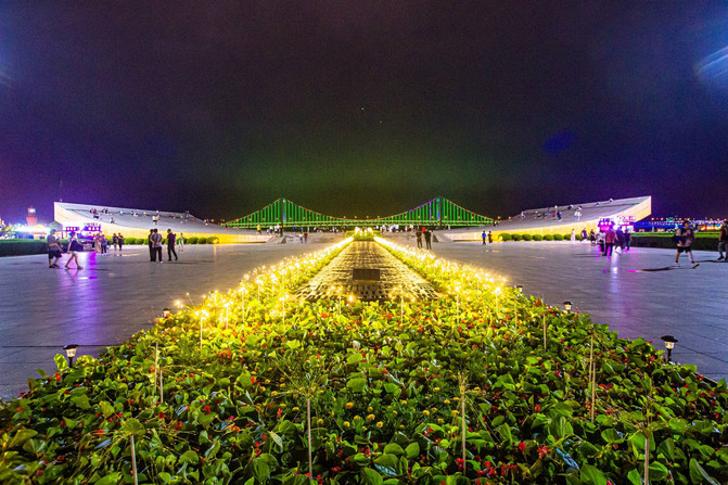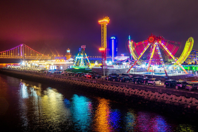 星海广场的接地气儿在于它的美,更在于它的可玩性。广场内有大型游乐场,每到夏天日落后,人们或呼朋唤友、或带着孩子家人,成群结队前来打卡。车来人往,笑语欢声,让整个广场甚至比白天更热闹,这里有着“最大连”的夜生活。