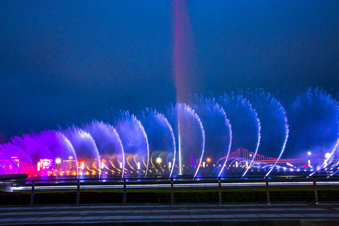 音乐喷泉随着音乐而舞动,跨海大桥的灯光也随之变幻,夜晚的海面呈现出幽深的蓝,引人遐思。