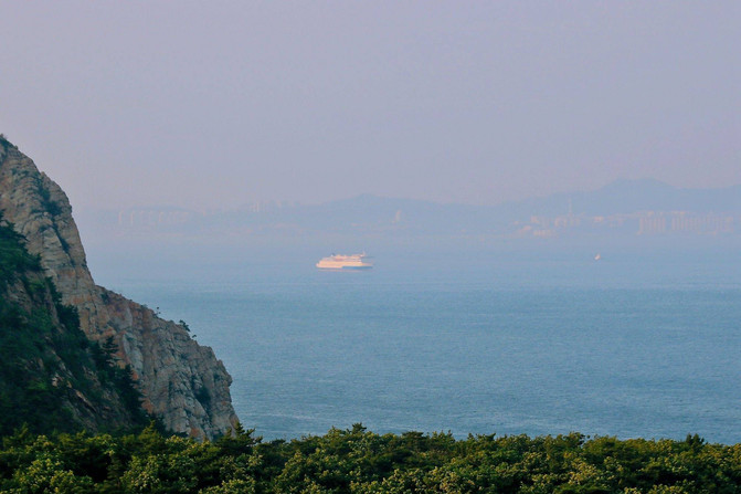 因为毗邻棒棰岛,站在公园高处可以远远俯瞰到整座岛屿,海风徐徐吹来,海上飘着薄薄的云雾,让海岛看起来更加神秘。
