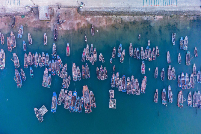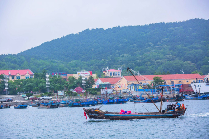 码头上船来船往,一派繁忙景象。渔民们出海捕鱼,游客们则奔向不远处的海王九岛欣赏美好的海上风景。匆匆而过的渔船在身后拉出长长的白线,仿佛在蓝色背景上描绘着美丽的画作。
