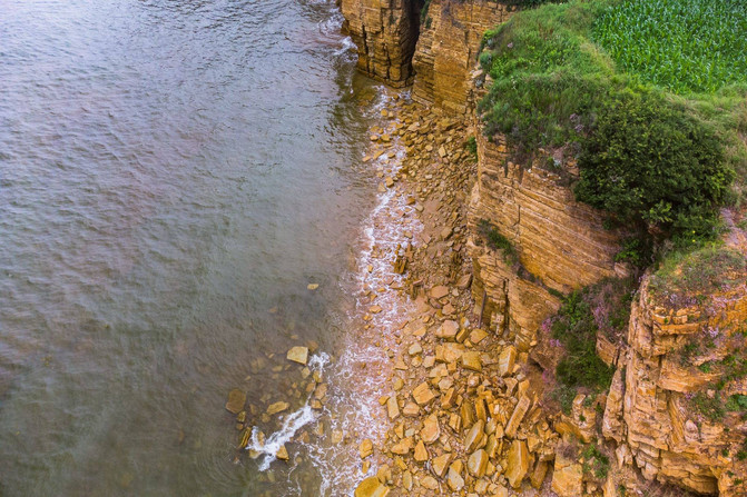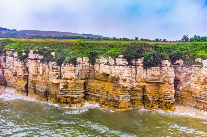 从远处看,礁石连排,顶部草木旺盛,仿佛高大的巨人肩并肩站成一片,迎风而立在蜿蜒的海岸线上。突出的部分深入海中,似乎是在试探着海的深浅。
