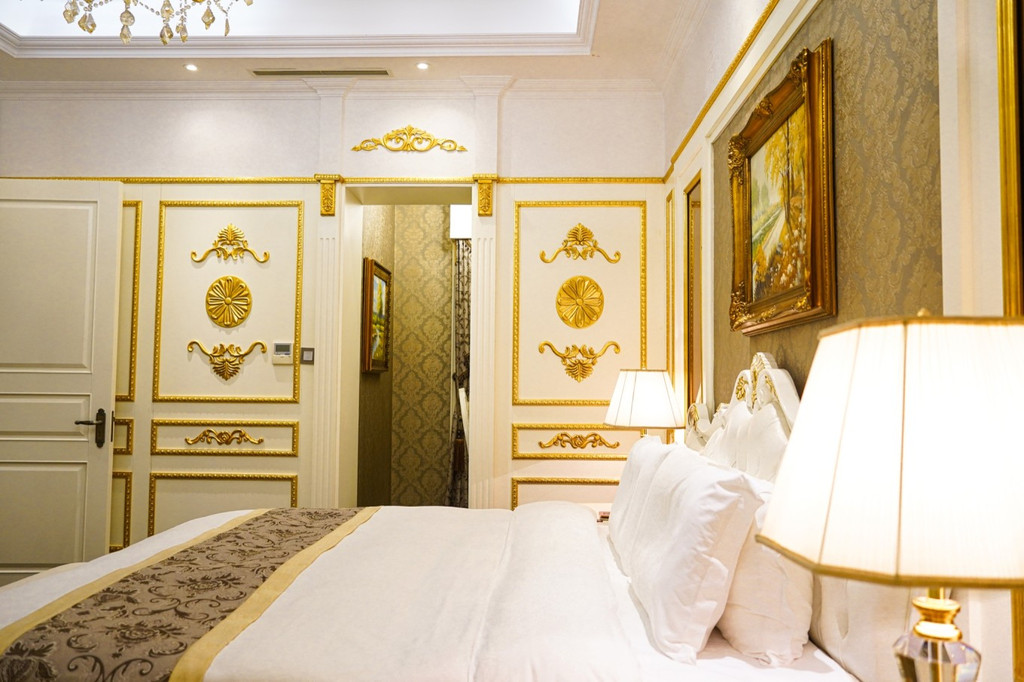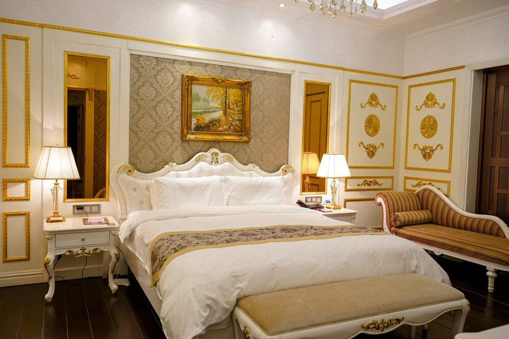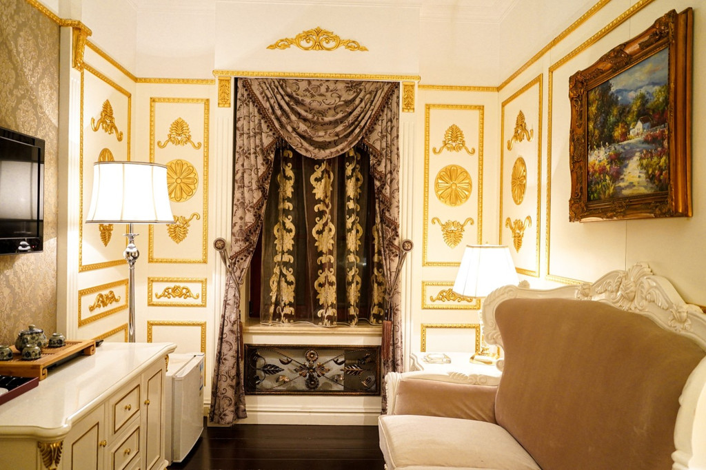 建筑式样为当时流行的折中主义风格,德式与俄式风格都具备!房间内饰是豪华的欧式装修,每个细节都设计的很精美,房间吊顶花纹、沙发、装饰画、窗帘都很欧式。