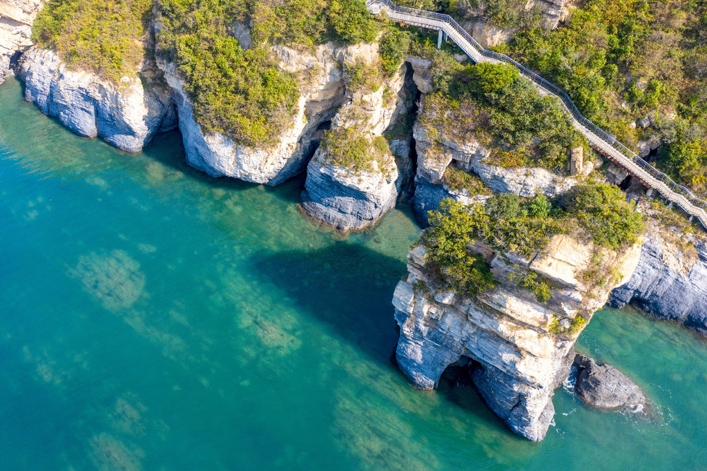 海是大连最瑰丽的外表,也是塑造大连地质积淀的灵魂。在大连滨海国家地质公园不仅能欣赏一望无垠、海天一色的海洋风光,也能领略数亿年之久所形成的地质奇观,尤以海蚀地貌最为引人入胜。大自然鬼斧神工下的杰作与人类天马行空的想象力相结合产出了诸多奇峰怪石,令人啧啧称奇。这里是海文化的聚焦点,石文化的博物馆,地质文化的展览厅。走在观景步道,奇峰怪石与大海相依相靠,金色的海面上渔民正出海捕捞,空中视角下,山海色彩清秀、层次分明,结构舒畅。山、石、林、海、岸、滩、船、渔共同组成了一幅大连绝美的山海画卷。