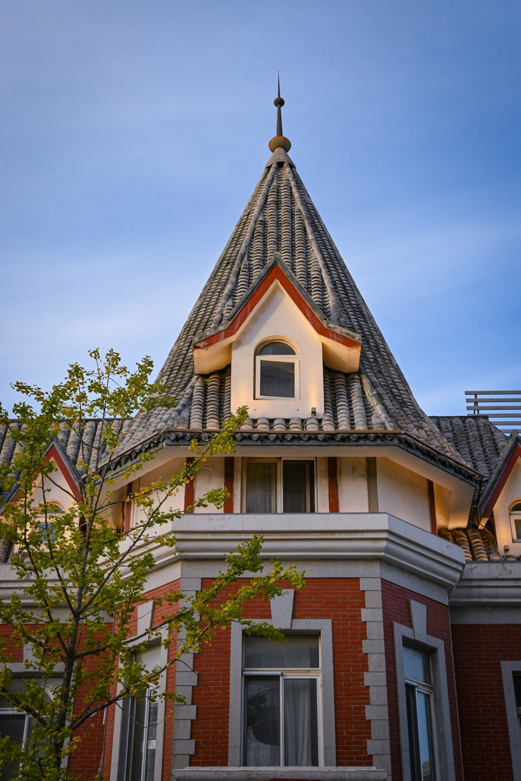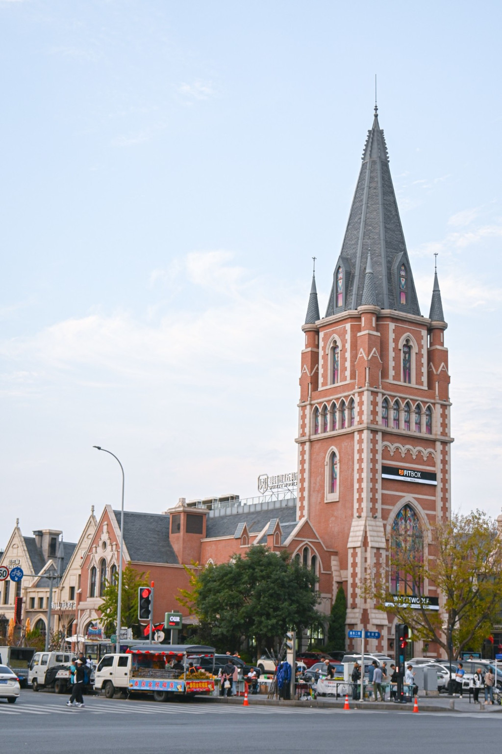 走着走着,异域风情随着傍晚的晚风吹拂而来,原来,我到达了 俄罗斯 风情街。 大连俄罗斯 风情街是 中国 首条保留十九世纪末、二十世纪初 俄罗斯 风情的老街。这里曾经是在 大连 的 俄罗斯 人聚居之处,而今天,是一个售卖 俄罗斯 特产,拥有异域风情的特色街区。此时此刻,正值摄影师们最爱的蓝调时刻,我立刻从包里拿出相机,站在这座外观参差,秀丽典雅的 大连 艺术展览馆前,拍下了这趟旅行最喜欢的一张照片。天时地利人和的共同作用,最终成就了这张当我再次打开,仍旧欣喜不已的照片。