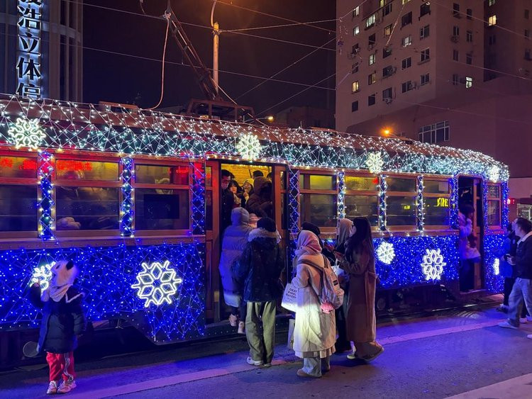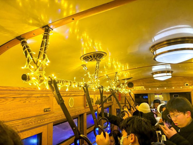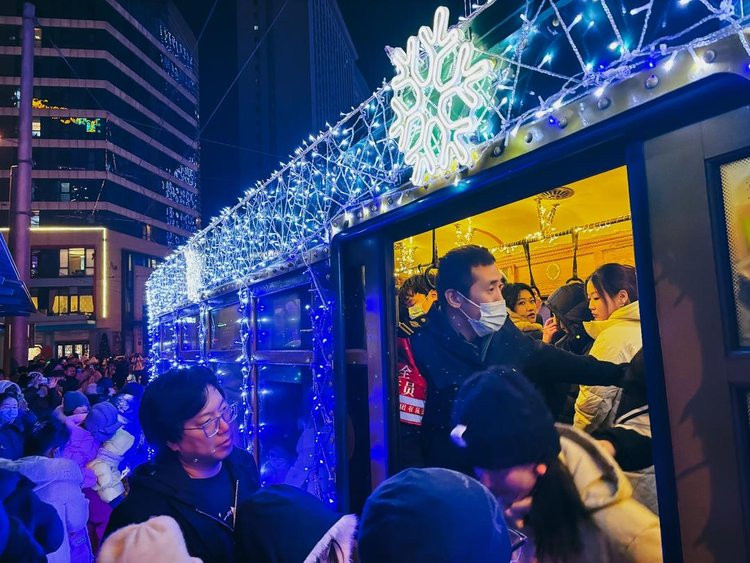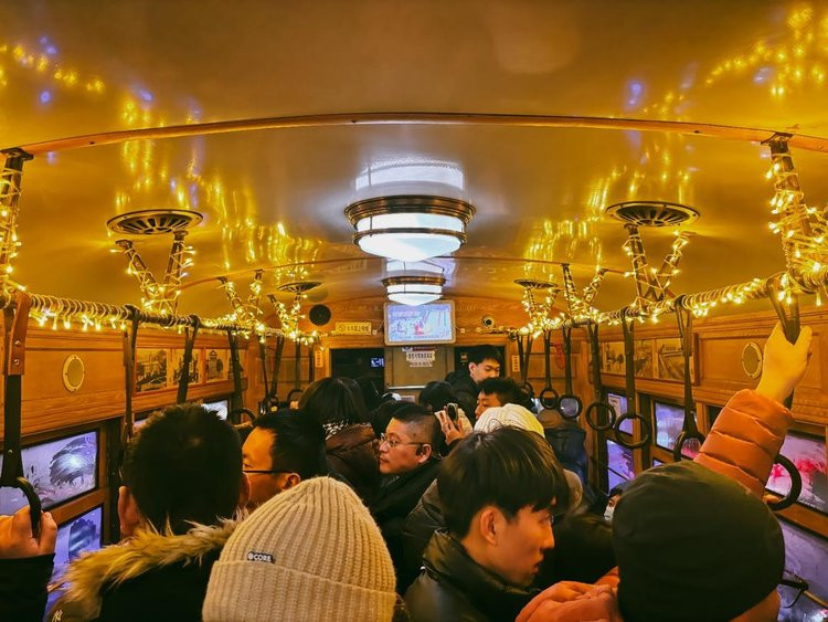 跨年夜当天为了登上列车的游客超多,车内也是张灯结彩特别好看,成为城市流动的光影风景线。