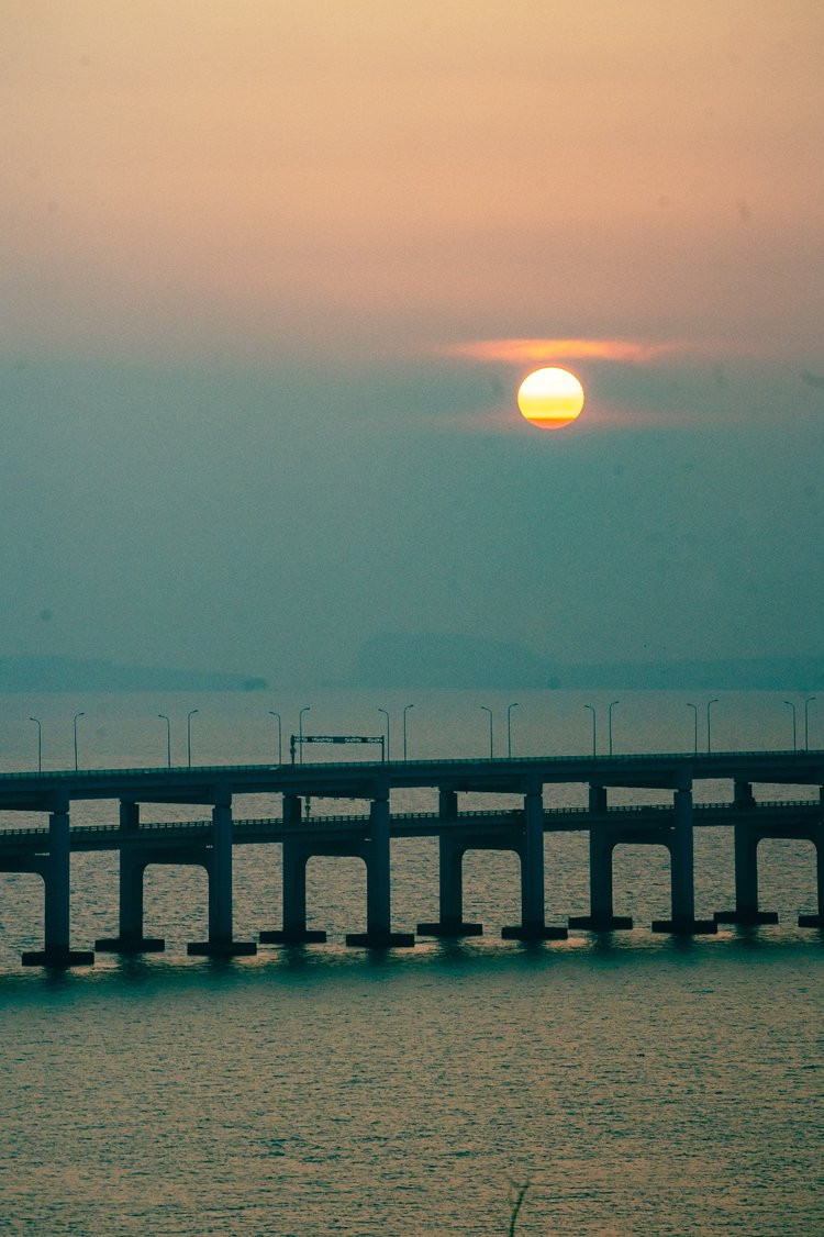 在观景台这里欣赏日落的人也很多,大桥上忙碌行驶的列车和自然景色交互相应。随着时间的推移,太阳逐渐沉入海中,天空也变得更加绚烂多彩。