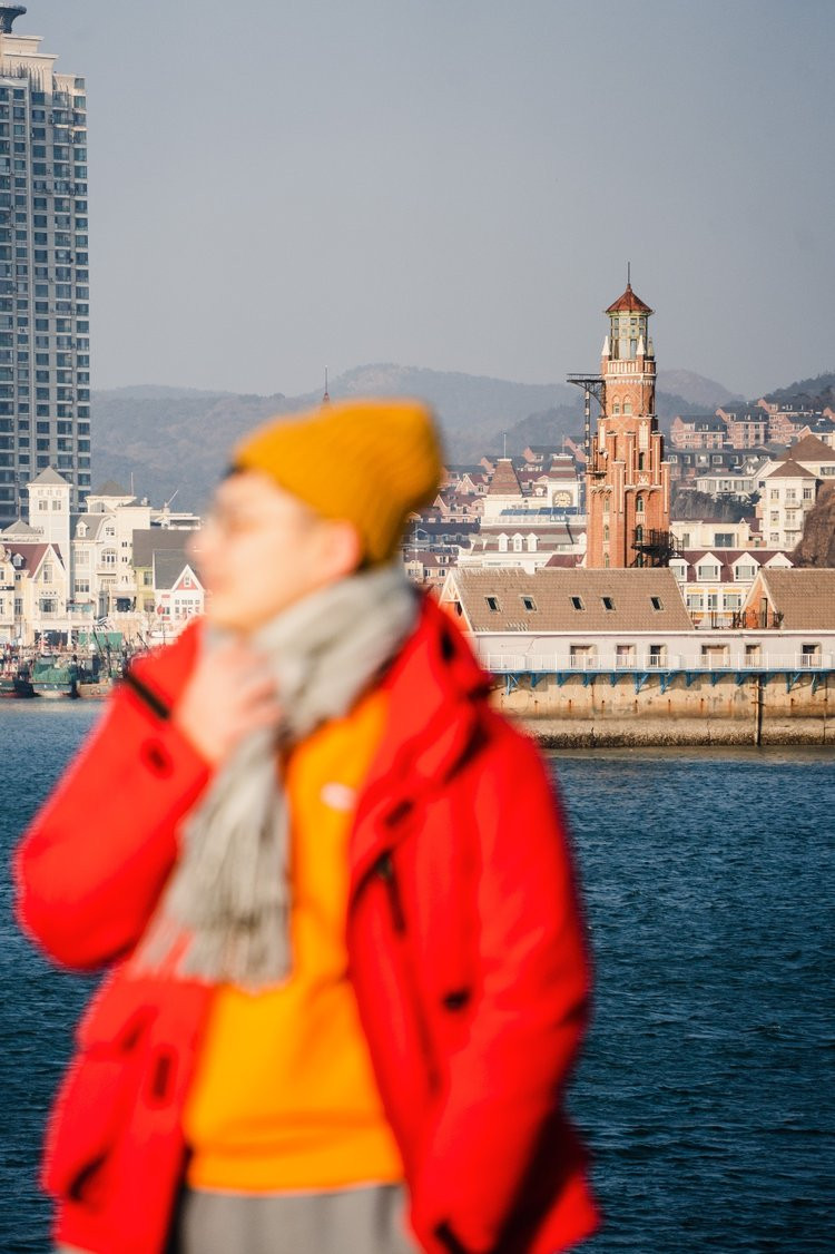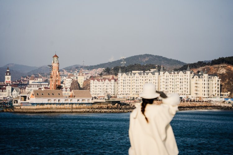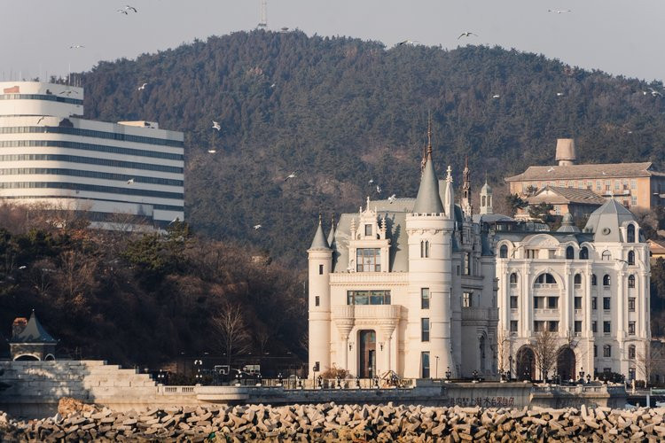 好看的机位当然是到对面的老虎滩海洋公园,在滨海边上遥遥远眺渔人码头的建筑,不时还有海鸥盘旋在海上,冬季的海宁静又神秘。