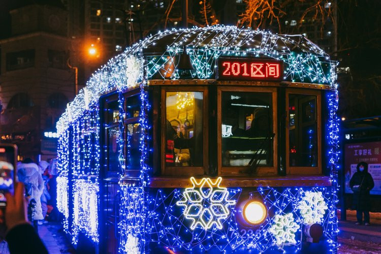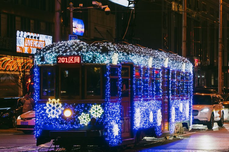 新年期间最不可错过的就是光影电车(201复古电车)。这个复古电车赚足了眼球,用Led彩灯将几辆201电车的外部包裹着,大连独有的百年有轨电车梦幻外观。