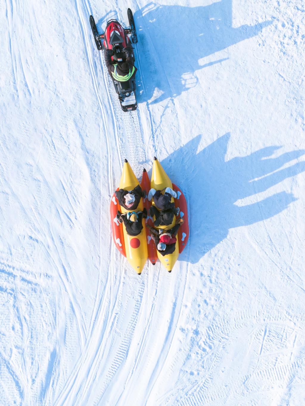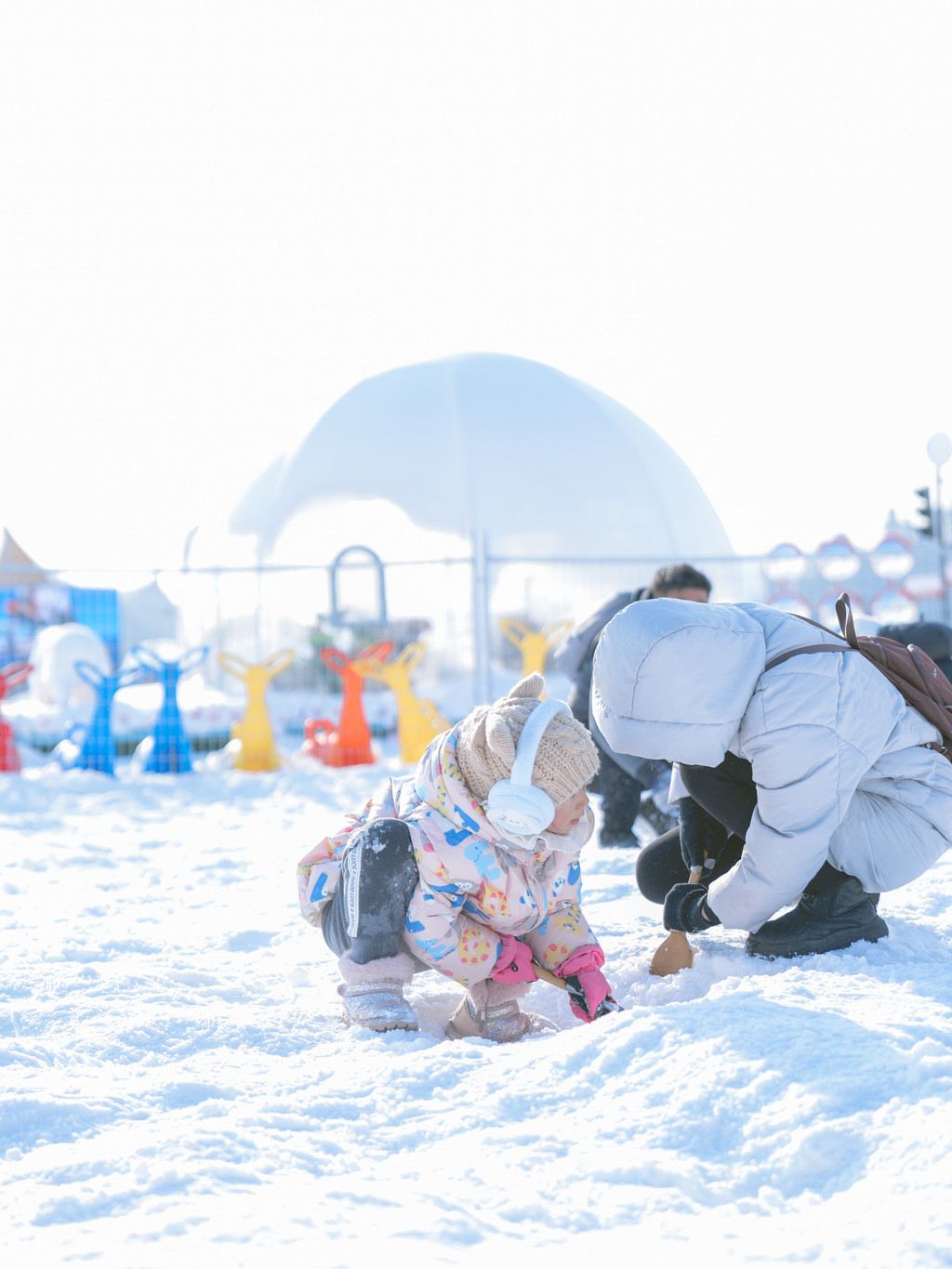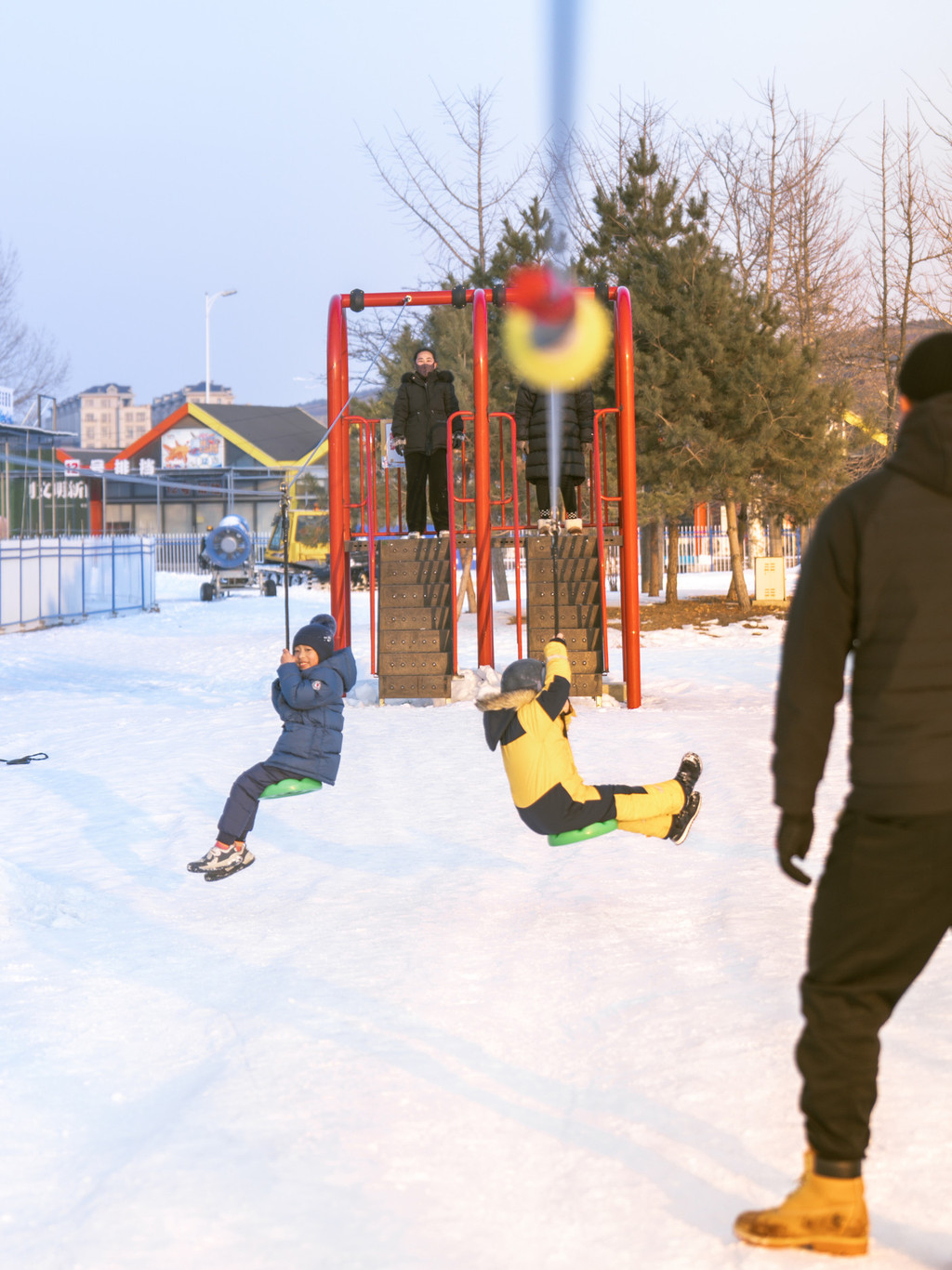 大连金石滩的快乐雪世界是标准的“溜娃”圣地,堆成山的雪圈随意选。能看到的娃娃都是在雪圈里被溜着走的,在这可没有吵着要大人抱抱的,包太沉也都是放在圈里溜着走。这些雪圈都是含在门票里的,不需要缴纳押金,不用费心保管,这个颜色坐腻了随时随地换。