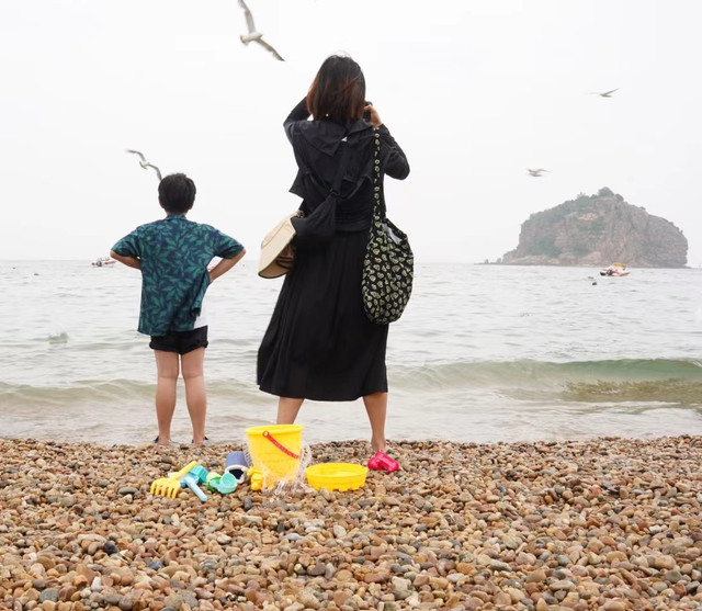 早上:来到海滨城市,去海边赶海也是必不可少的一项任务。原先考虑去黑石礁公园,因为人相对少点。但棒棰岛实在太火了,连当地出租车司机都说来大连旅游应该要去棒棰岛玩一玩,那里的海水比较清澈,所以我们改变了行程。10:00搭乘出租车,10:40到达棒棰岛风景区(辽宁省大连市中山区迎宾路1号)。如果你只是来玩石子滩的话,购票后直接进公园入口,不要理会路边的黄牛。这里要补充说明一下,所谓棒棰岛,是站在棒棰岛公园石子滩上远观那形似棒槌的小岛而已。由于阴天,虽然不是很晒,但海水冰凉,不宜下水。今日赶海时间为11:00-12:00,属于晚潮又是死讯,潮汐不明显,只寻到了些海带、海草便草草收场。不过小朋友在石子滩上也玩得不亦乐乎,筑堤防、挖水渠,但又每每被无情的海浪给吞没了;成群结队的海鸥在空中盘旋,好像在告诫孩子们一定要小心这凶猛无比的海浪……足足玩了3个小时,小朋友还久久不肯离去。