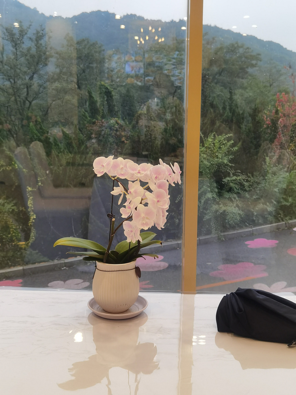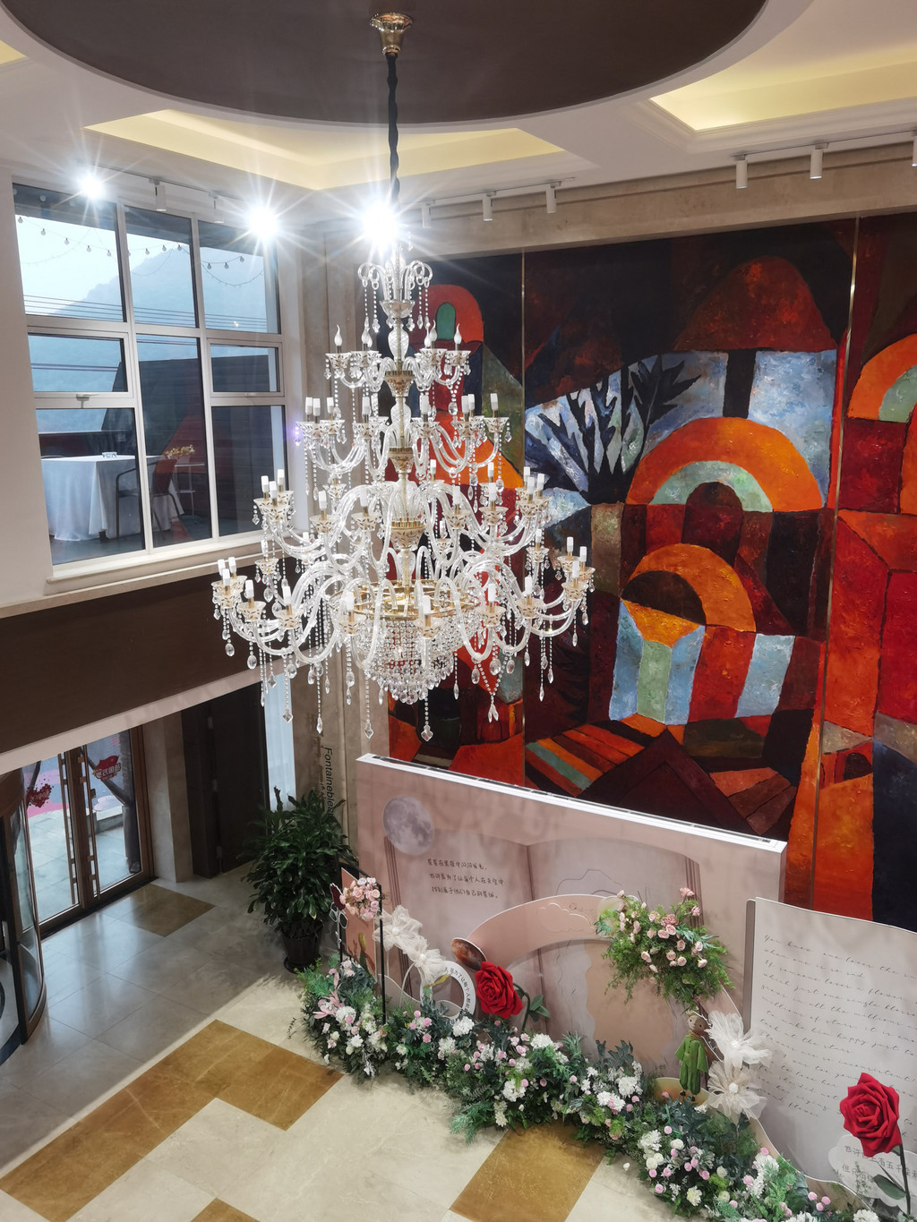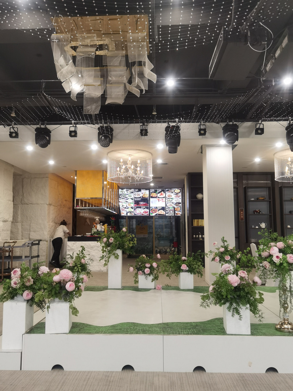 4点半出来找吃的,酒店外面基本就是森林,没有餐馆。我们就在一楼的餐厅吃。这家酒店去年新开,早餐厅中间是婚礼仪式的场所,四周都是粉色的月季和花点缀,很温柔的感觉。