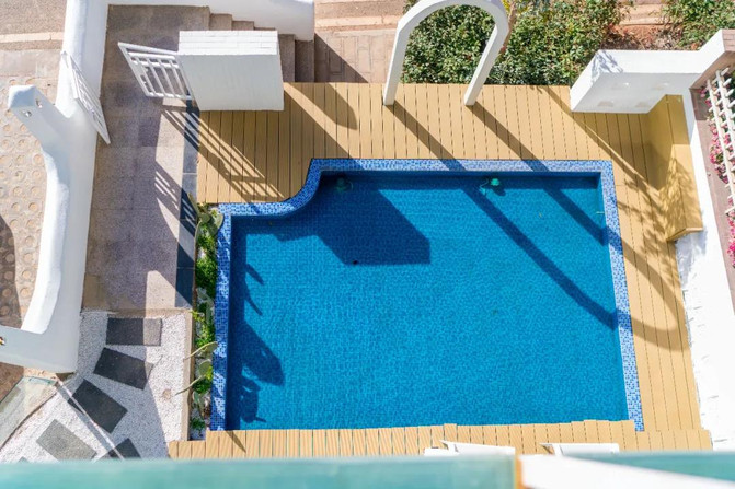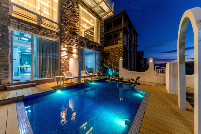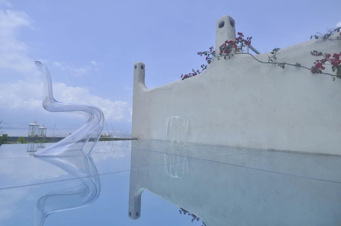 圣托里尼风格马卡龙色系的建筑在一望无际的蓝中格外引人注目,仿佛身置希腊的爱琴海。