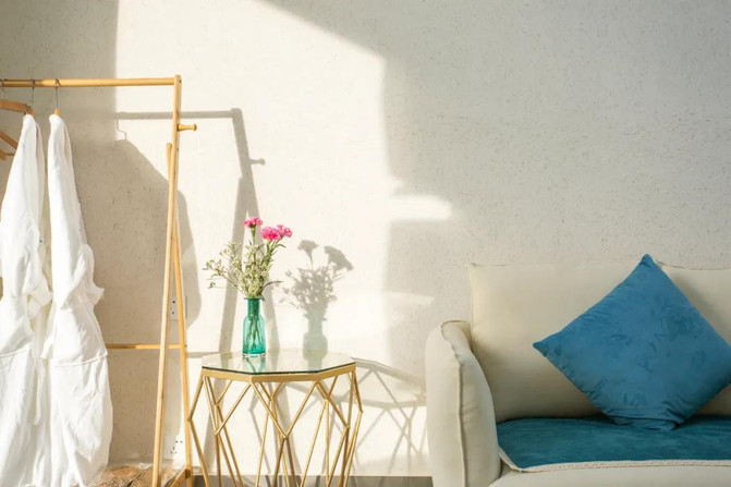 公共区域整体风格以蓝白为主,简约大气。座椅楼梯地板多为木质,黑钢灯具,棉麻抱枕,暖黄的灯光,细节处透露出设计感,简洁清爽却又不失温馨。
