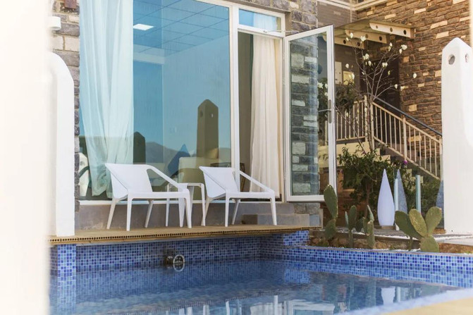 房间整体风格是以蓝白为主的希腊圣托里尼风,与蓝天碧海相呼应,美不胜收。家具床品多为木质,隐约透露着自然的气息,令人心旷神怡。