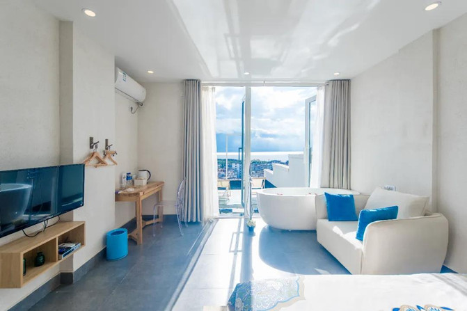 特级星空海景套房,房间视野开阔,仿佛一伸手就能触摸到柔软的天空,给人更盛大的感官体验。