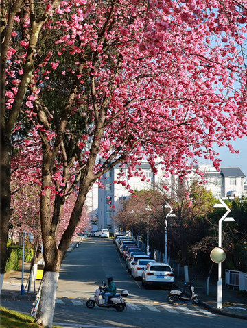 大学“创新路”行政办公楼前面。这里靠办公楼一侧的路边,全是高大的樱花树,枝干茂盛花开正艳。是旅拍赏花的好地方之一。