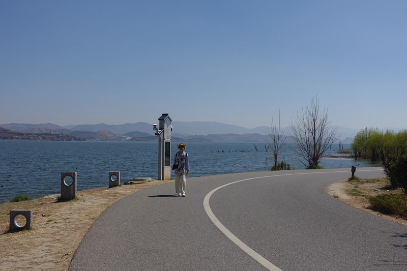 第二天早上7点,坐地铁5号线到迎海路站,沿迎海路走10几分钟到滇池海埂大坝。这里早上7点半太阳才出来,所以这个时节的早晨还是会有些凉意的,需要加个薄外套,但是到了中午气温就会升高许多,同时晚上太阳落山的时间也会相应比较晚,19点30分日落,早晚温差比较大。