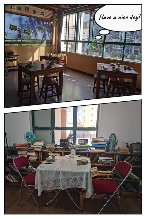 逛完海埂公园回酒店稍作休整,今天的晚餐打算吃吃云南菜,七步香云南山里菜(原中华小学校址店)就在酒店马路对面老街这里,这家店址原本是一座小学,装修风格很怀旧,都是些小时候用的老物件。