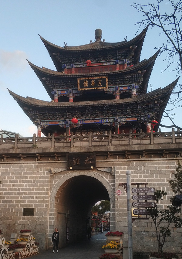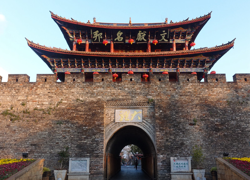 南城楼,称双鹤楼又称承恩楼。南城门是古城四门之首,始建于明洪武十五年(1382年),为古城最古老雄伟的建筑,是大理古城的象征和标志。古城墙四面各长约1500米、高6米、厚达12米。城门上大理二字是郭沫若1961年游览大理时亲笔所提,意为大治大理 ,富国兴邦之意。