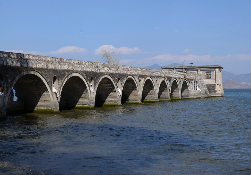 向阳溪村的廊桥,网红打卡点。是一座延伸进洱海、独具特色拱形桥状的水渠。历史上,曾经是湾桥镇重要的灌溉抽水渠。洱海上这座带着岁月痕迹的水渠遗址,被年轻人称为了洱海廊桥。
