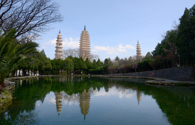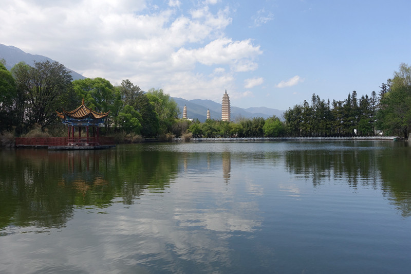 崇圣寺南门出来,走十几分钟到三塔倒影公园。公园坐北朝南,背靠三塔,以园内的潭水能倒影三塔而得名。门票包含在崇圣寺三塔文化旅游区门票内,开放时间:8:30-16:30
