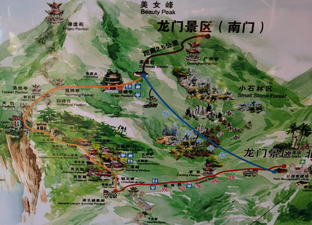 另一条游玩路线是观光车上,徒步上行依次游览龙门各景点,龙门索道下。