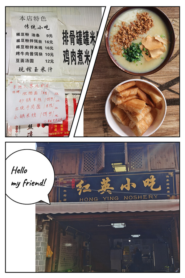 红英小吃,点了特色传统小吃,稀豆粉+油条 9元,这是当地人经常吃的早餐品种,是用豌豆做成的糊糊,吃的时候用油条蘸着吃,味道清淡也很不错。