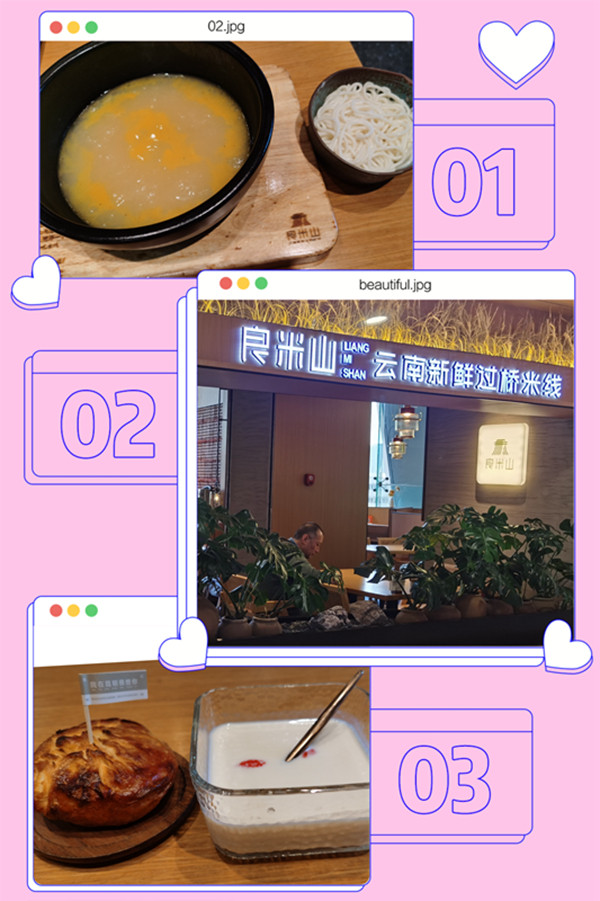 到了云南必吃米线,逛完老街在附近昆百大新天地良米山——云南过桥米线,买了68元/人套餐,米线不硬口感爽滑,荤素菌菇海鲜品种丰富,套餐里的松树皮、松针尖、芭蕉芯凉拌菜很有特色,烤包子甜品也不错。