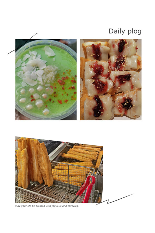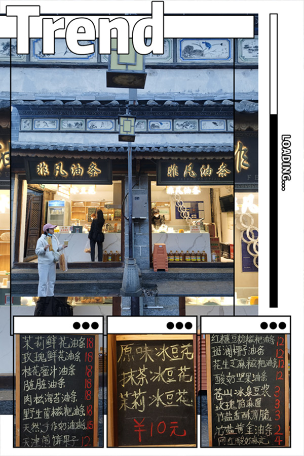 非凡有条——一家给我惊喜的店,普通版油条2元/根,还点了一份网红玫瑰蜜汁油条18元,店员阿姨用电饭锅热了一块糯米团子,分别铺在一节节油条上,然后再淋上玫瑰酱,趁热吃口味不错,有点像上海的年糕团,我们这里是把年糕团包在油条外面。第二天下午回古城走了有点热了,点了一份抹茶冰豆花10元,抹茶味很浓,上面除了有椰子片,居然还有爆浆珠,清凉不甜腻,赞!