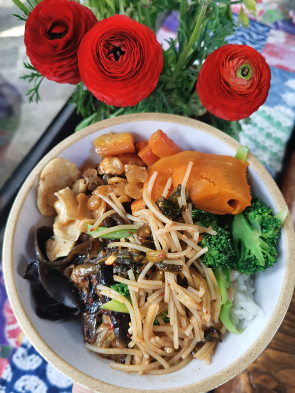 每个打饭阿姨两手开弓各拿一个勺子打菜,一共有10种多的素菜,切记吃多少打多少饭,斋饭不能剩下,不够吃了可以不排队直接去添,要喝汤的话得用自己吃过饭的碗去院子里盛,全部吃完后交到洗碗处有专门洗碗工清洗,过了饭点后下午的寂照庵就会清净许多。