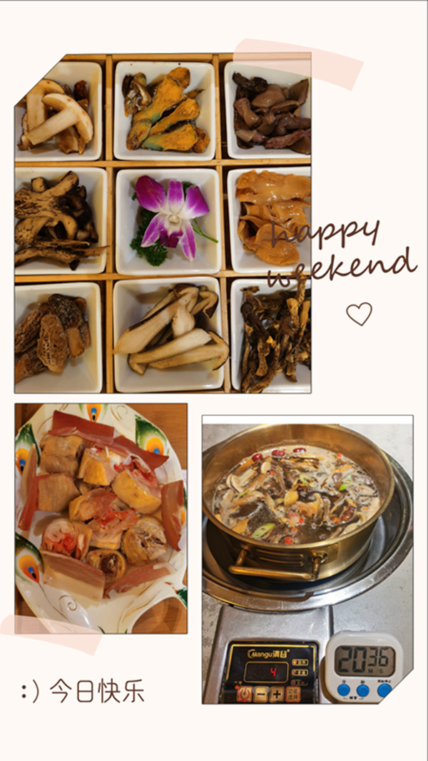 套餐里写着鲜羊肚菌、黑鸡枞菌、牛肝菌、鹿茸菇、黄牛肝菌、雪灵芝菌,红乳菌、黑虎掌菌,现在的菌菇基本上都是冷藏的,新鲜的要到7、8月份上市,服务员把所有的菌菇下锅后打开了计时器,特地关照20分钟内任何餐具不能放入锅内。
