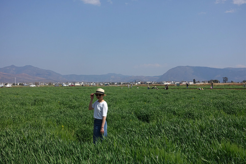喜洲稻田这个季节麦穗还没有长出来,等到7~8月份成熟季,金色的稻田才能够更加完美地体现出风吹麦浪的景色。 稻田边上有许多摄影摊位拉客拍照。