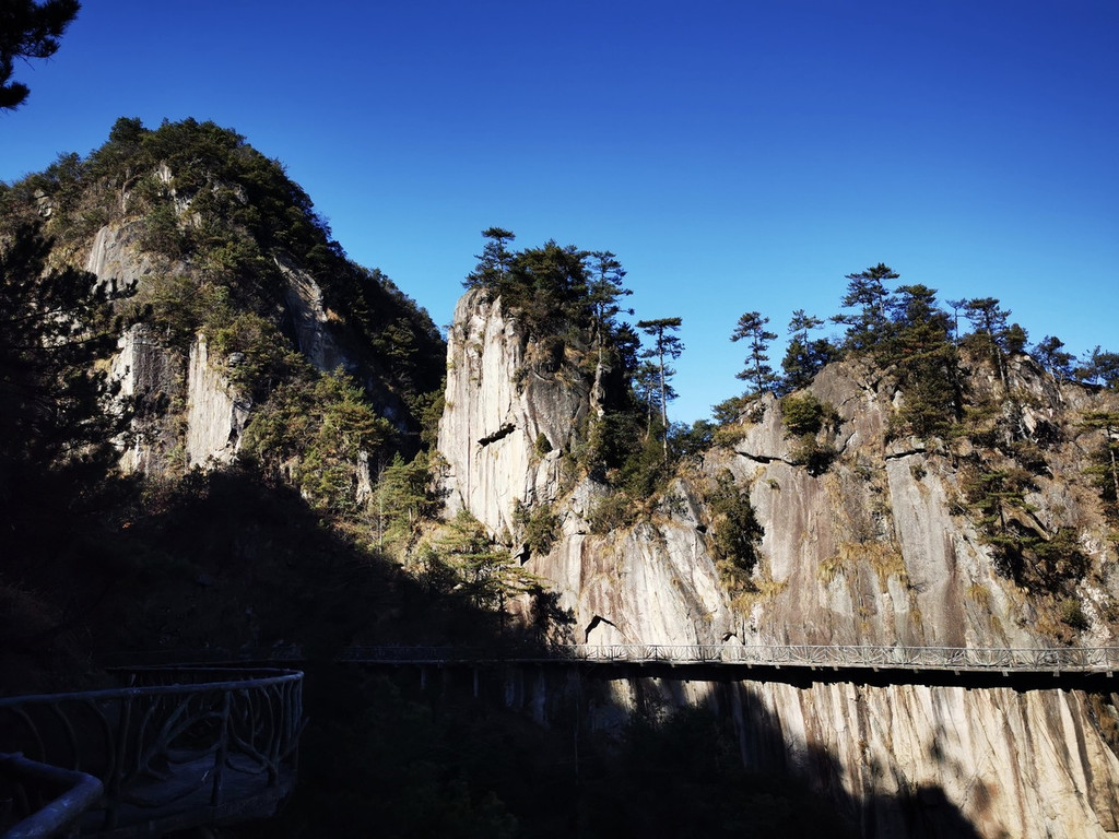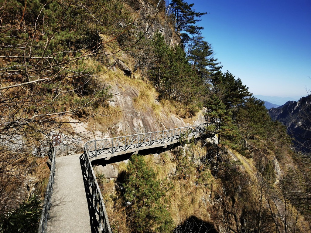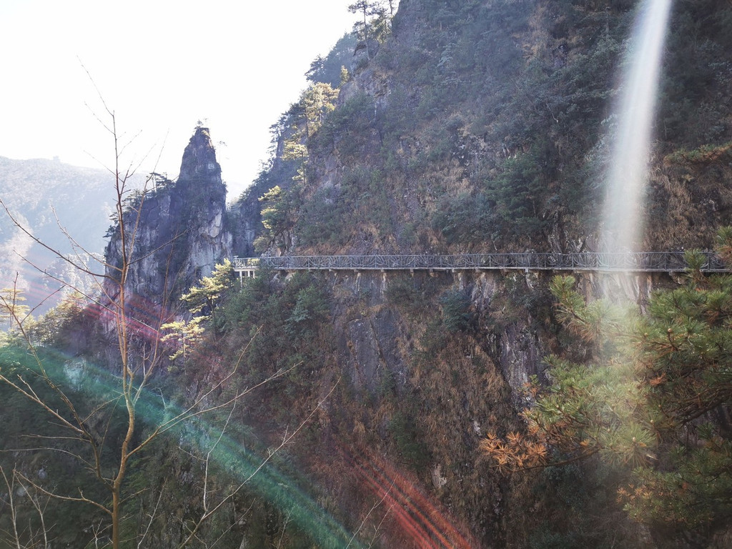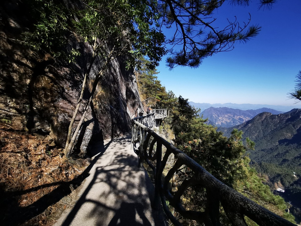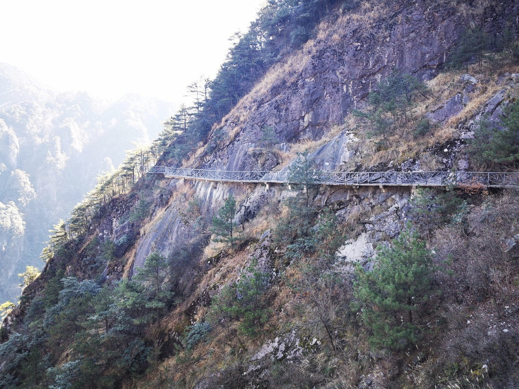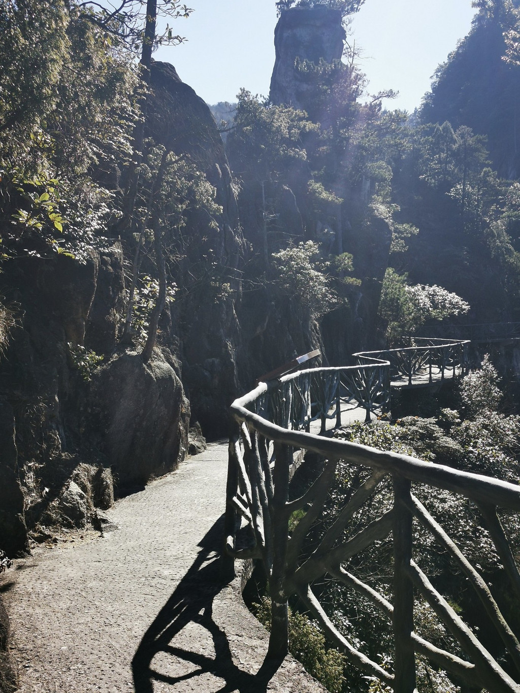 悬空栈道修建蛮长的,都建在山腰之上,工程也相当不容易,走在悬空栈道,阳光透过松树丛中,午后特别惬意的游玩路线。