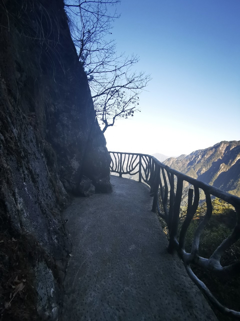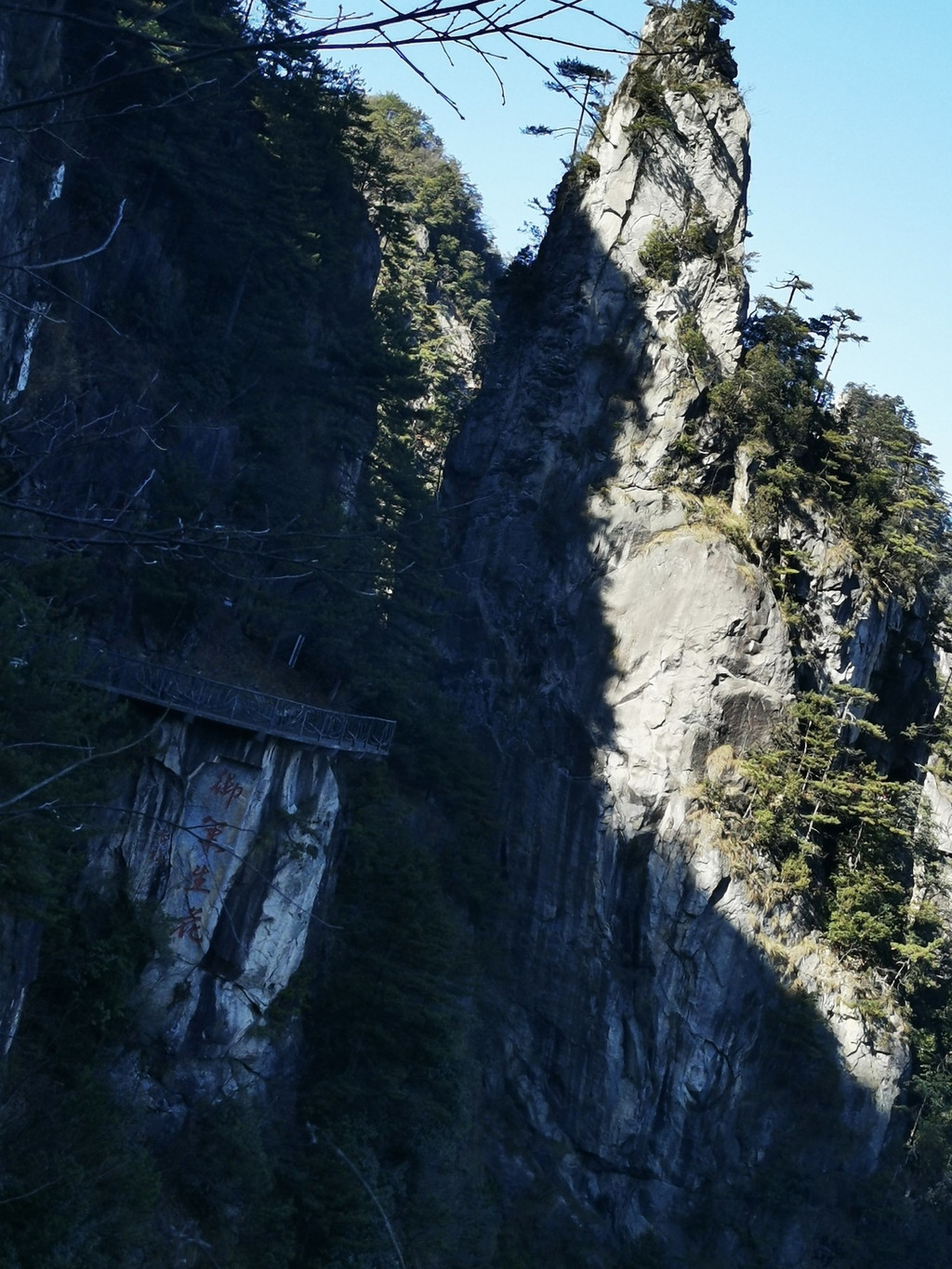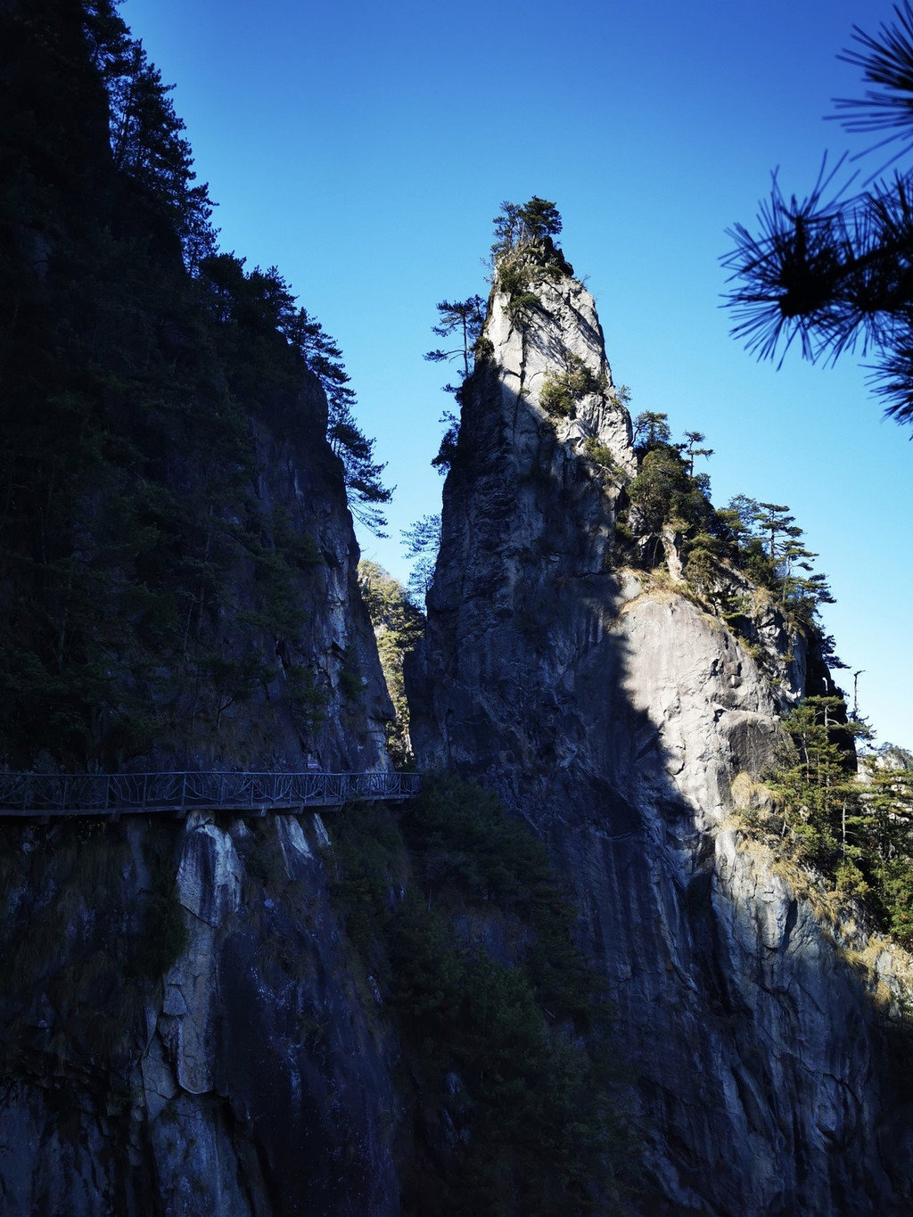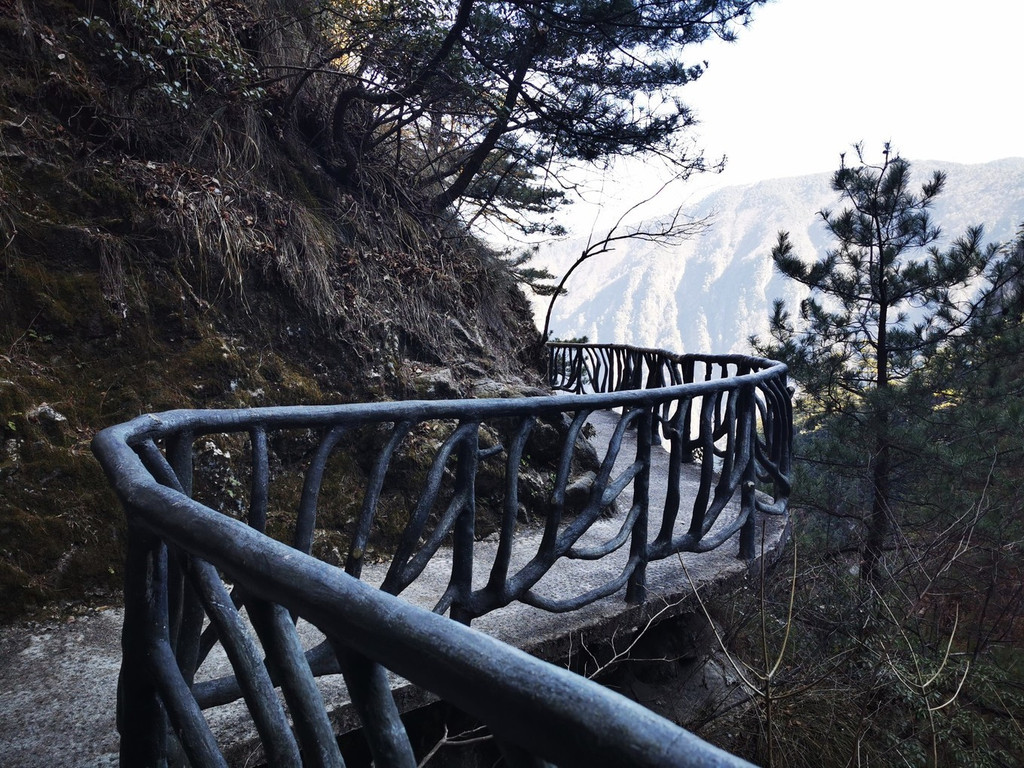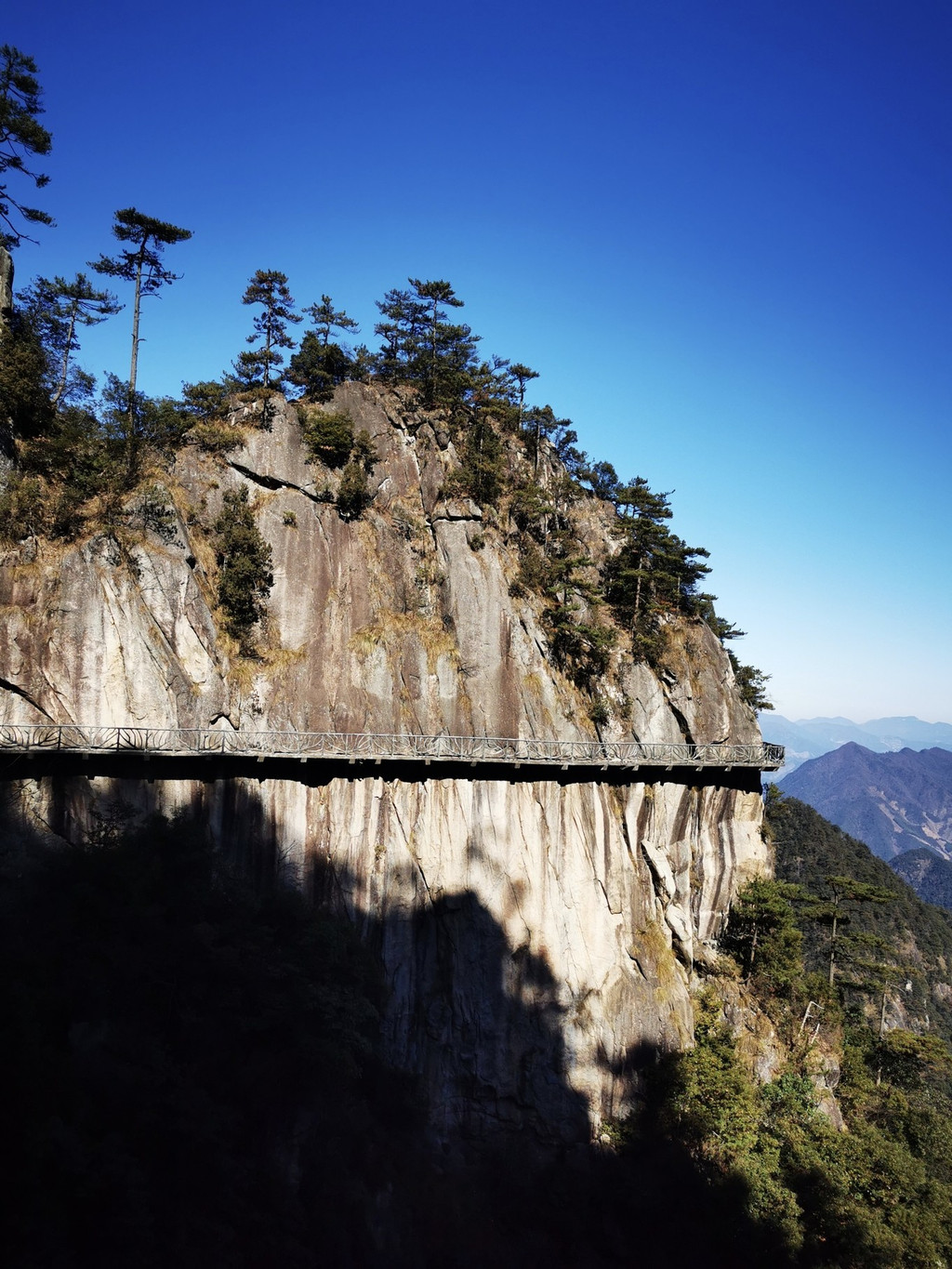 悬空栈道修建蛮长的,都建在山腰之上,工程也相当不容易,走在悬空栈道,阳光透过松树丛中,午后特别惬意的游玩路线。