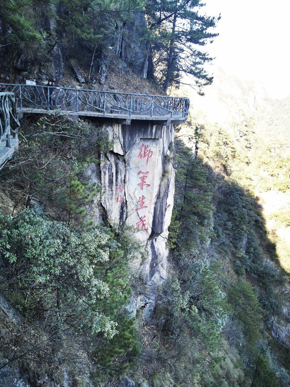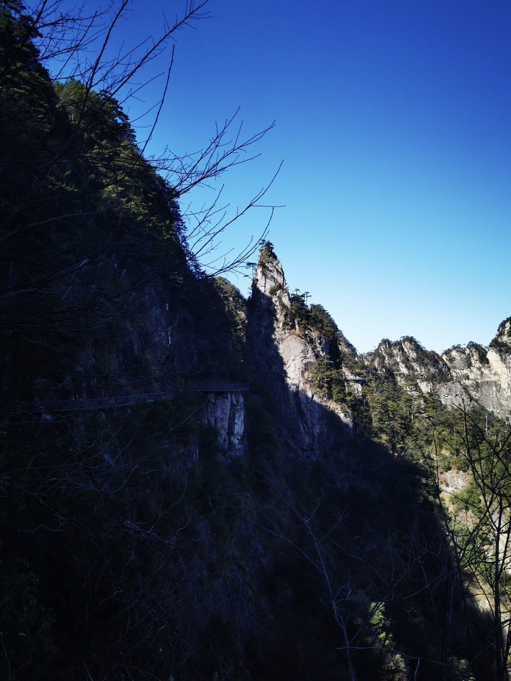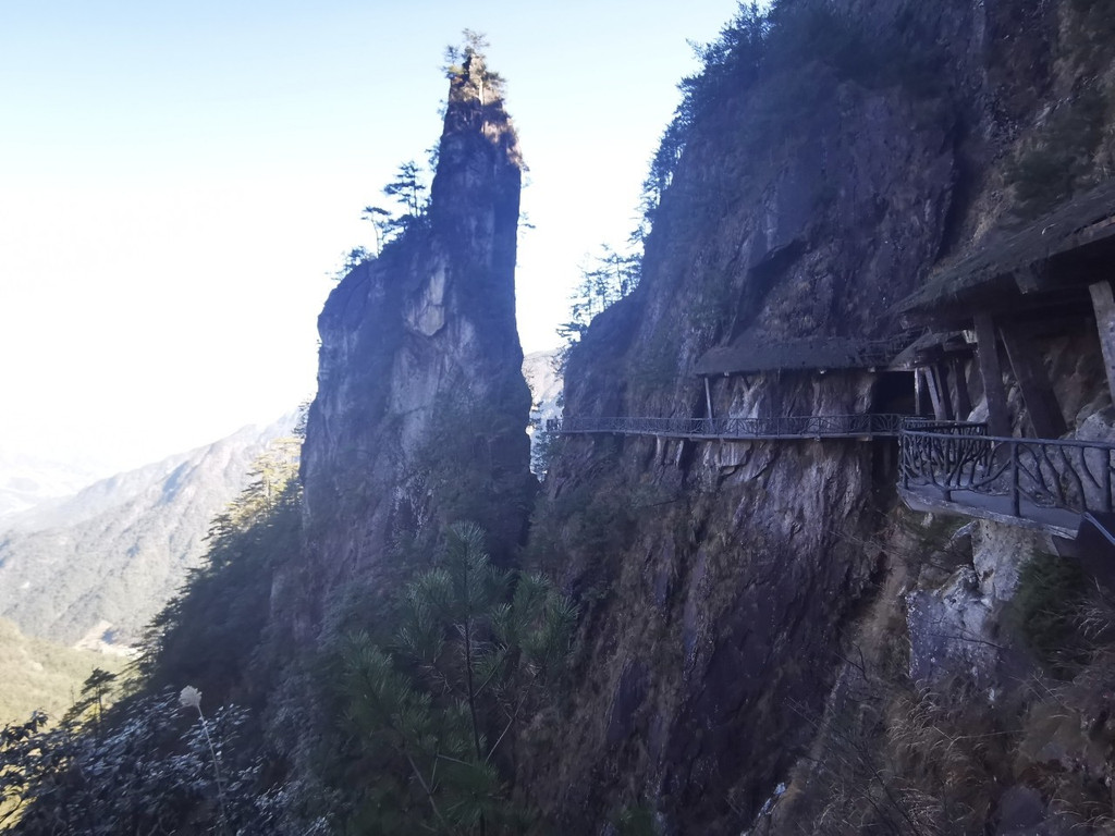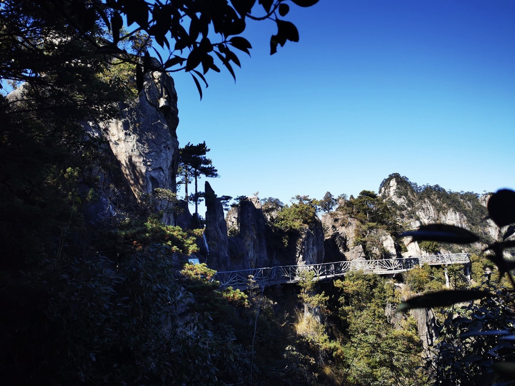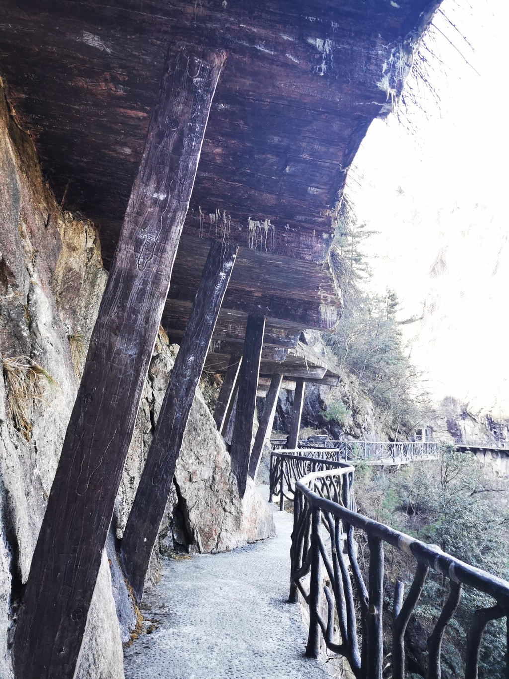 悬空栈道修建蛮长的,都建在山腰之上,工程也相当不容易,走在悬空栈道,阳光透过松树丛中,午后特别惬意的游玩路线。