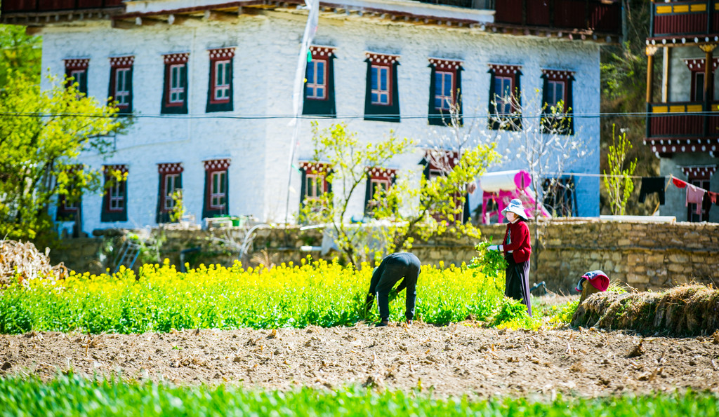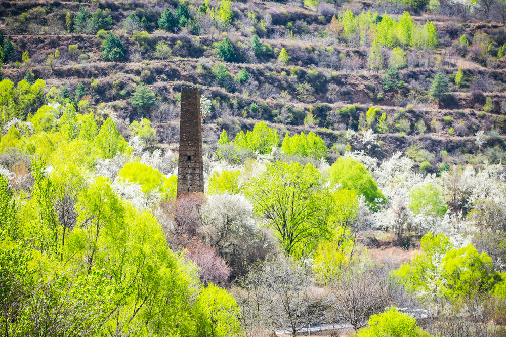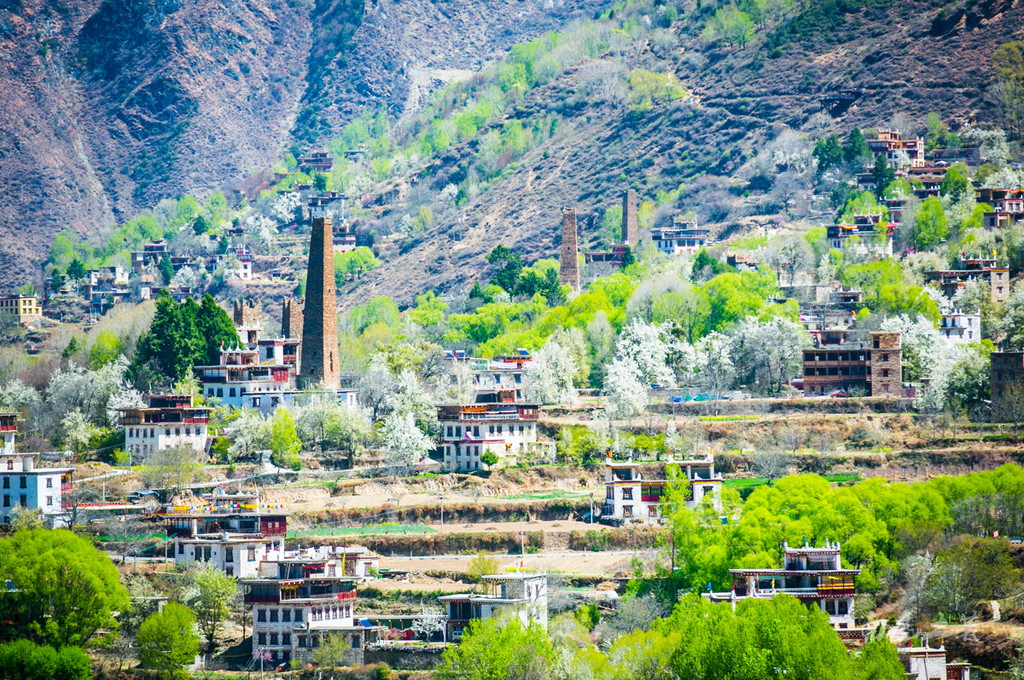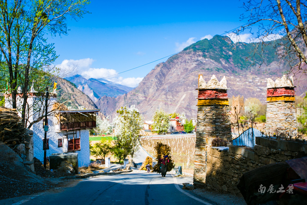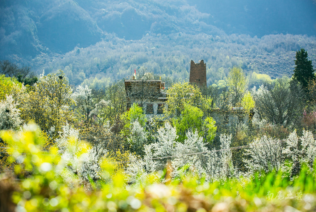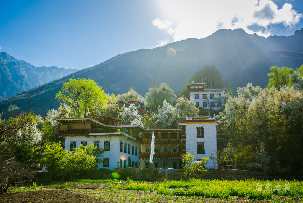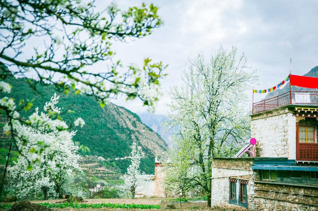 中路藏寨位于海拔3000米左右的山坡,星罗棋布的藏房错落有致,春天的到来让这里绿树成荫,绿荫间洁白的梨花丛丛,将民居包围,自然宁静。