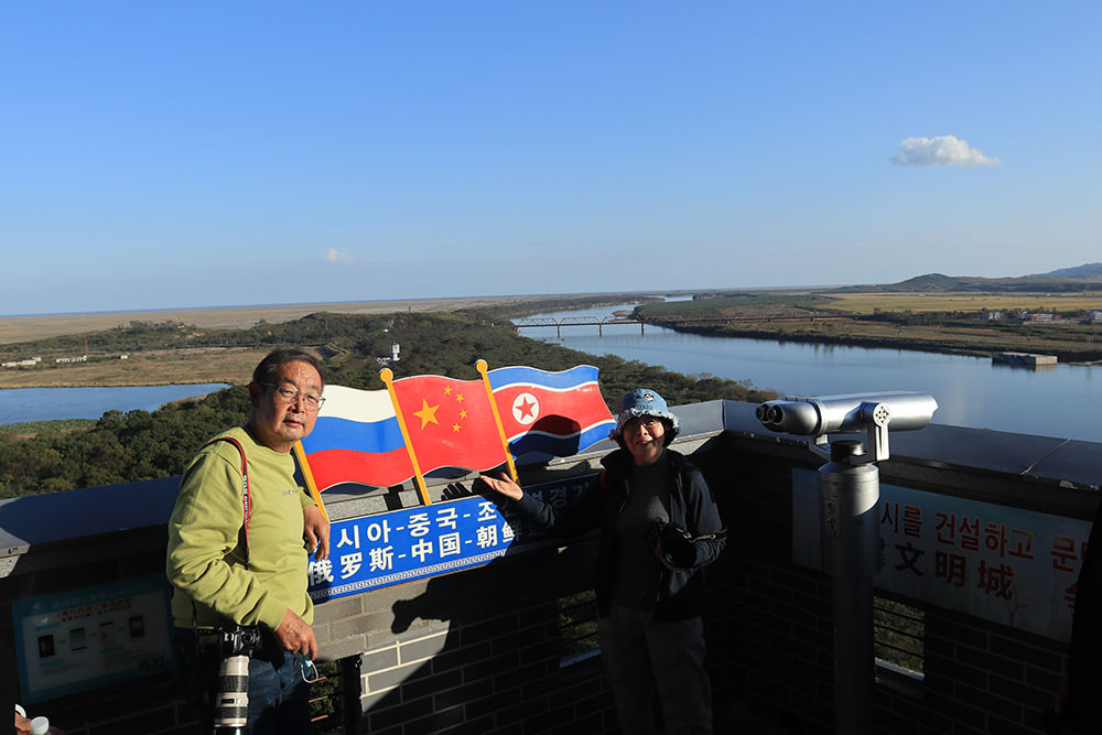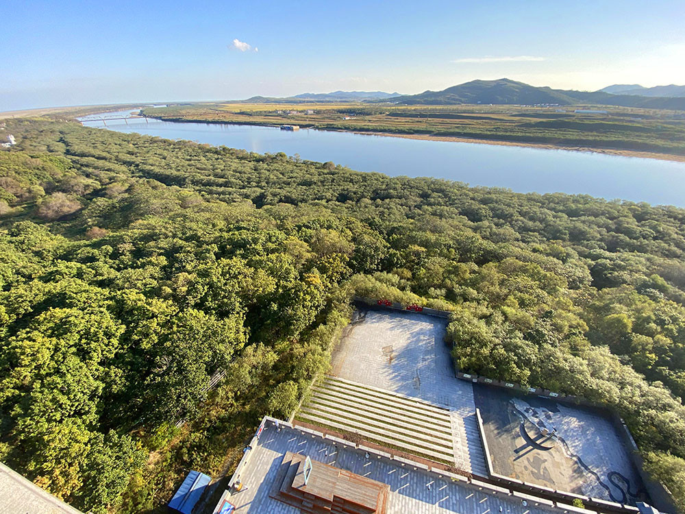 到防川风景区的停车场换乘景区的大巴车,很快就到了边境线上的龙虎阁,那是一座13层的仿古建筑,高64.8米。乘电梯上到观景台上,三国的地貌清晰可见。