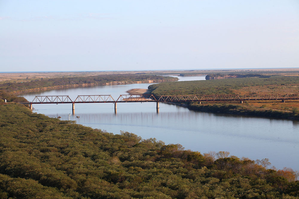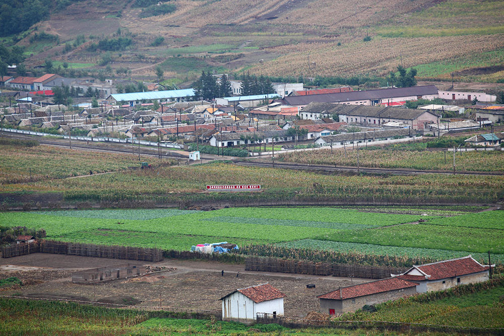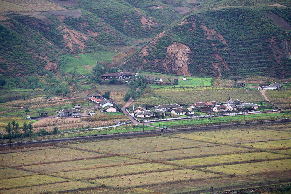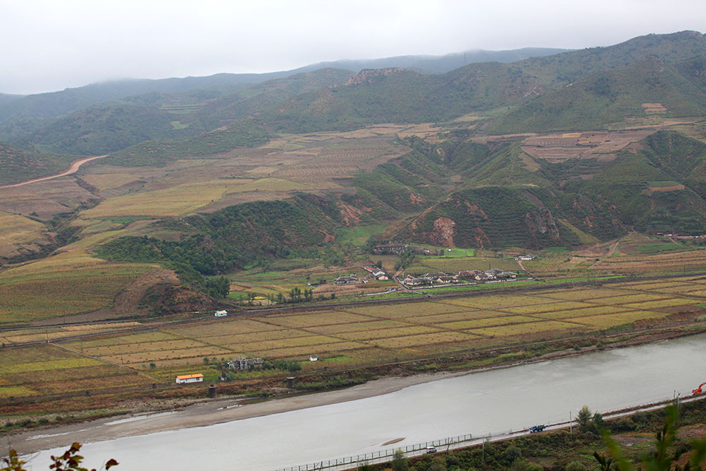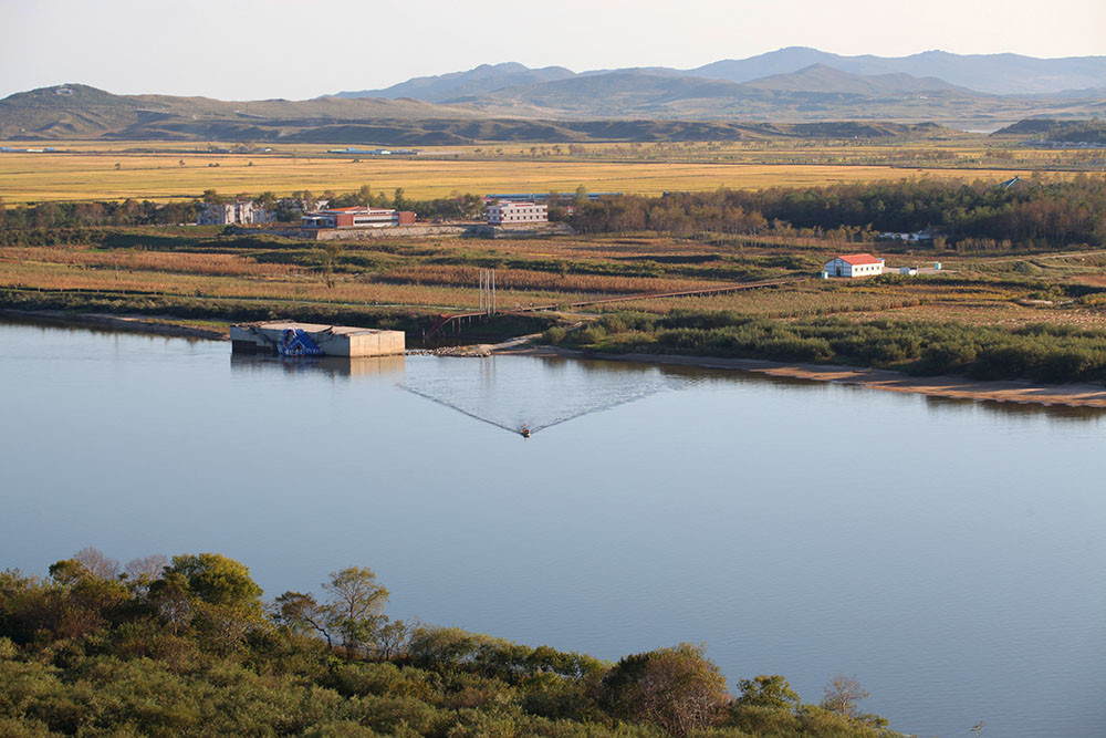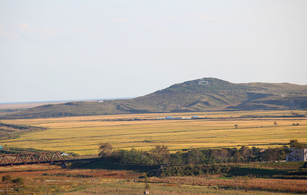 图们江是朝鲜和俄罗斯以及中国的界河,一座铁路桥连接着朝鲜和俄罗斯,是朝俄陆路贸易的唯一通道。 朝鲜一侧归豆满江市管辖,只见农舍散落,沃野千顷,正值水稻成熟的季节,黄灿灿的一片,看来今年是个丰收年。