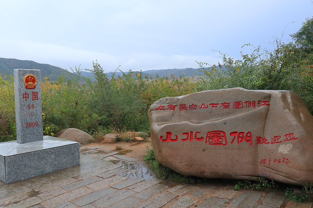 紧挨着就是那座86号界碑,那里也是图们江的老码头,江面不宽,对岸的一草一木都清晰可辨。界碑旁有一个巨大的石碑,上面写着“山水图们欢迎您”,站过去,来一张靓照。